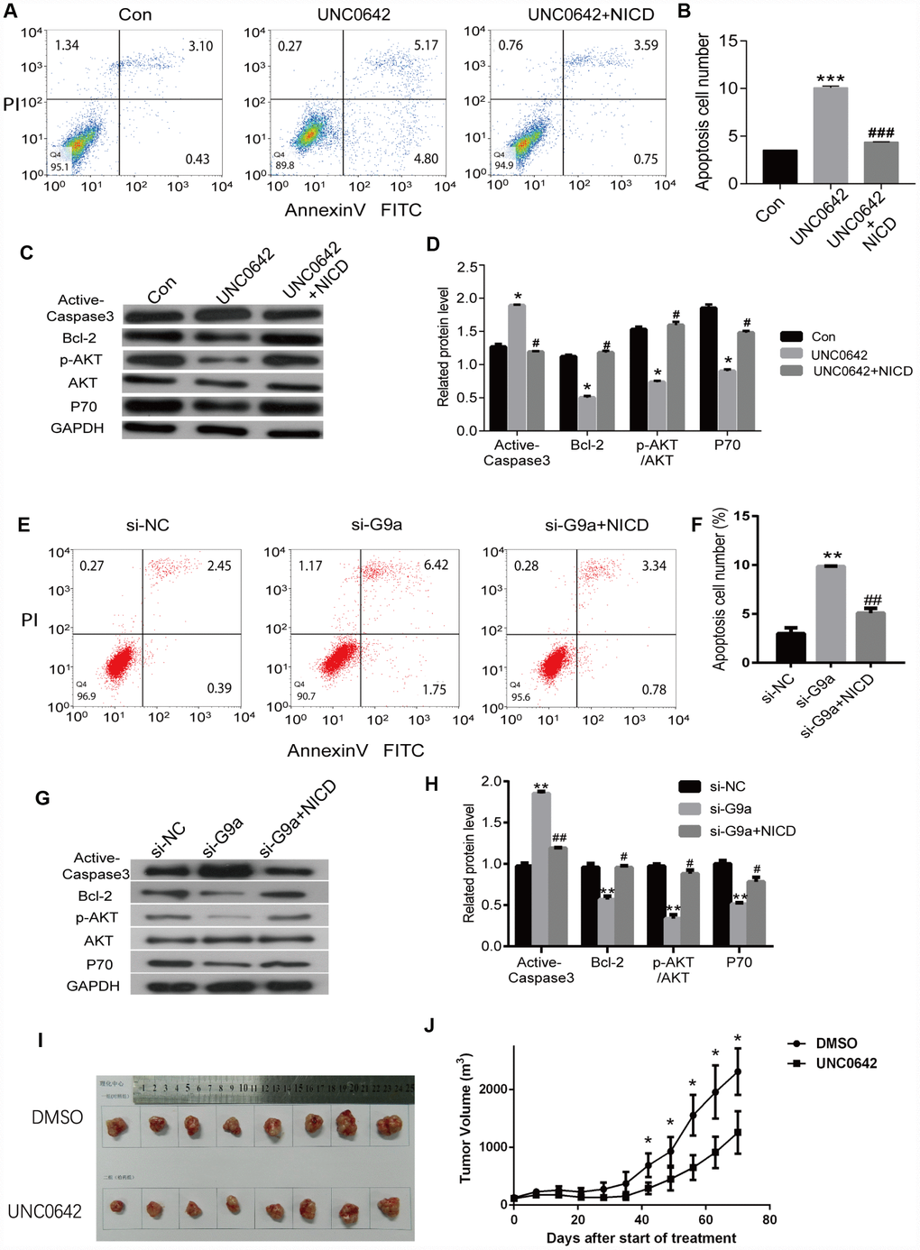 To evaluate whether UNC0642 is capable of inducing apoptosis, we double stained melanoma cells treated with UNC0642 with Annexin V-FITC/PI. Using flow cytometry analysis, we observed an increase in the ratio of apoptotic cells upon UNC0642 treatment, and the ectopic expression of NICD could inhibit this apoptosis caused by UNC0642 treatment (Figure 7A, 7B). Moreover, there was a significant increase in the expression of apoptosis marker, cleaved Caspase-3, in melanoma cells upon UNC0642 treatment according to Western blot analysis, while the expression of Bcl-2 was remarkably reduced (Figure 7C, 7D). Meanwhile, we sought to determine whether UNC0642 treatment had an effect on the PI3K-AKT signaling pathway. The results revealed a decrease in the activity of the PI3K-AKT signaling pathway in melanoma cells treated with UNC0642 at concentrations of 2 μM (Figure 7C, 7D). Ectopic expression of NICD could rescue above results (Figure 7A–7D). Further, we confirmed the above experiments with G9a knocking down by siRNA. As shown in Figure 7E, 7F, we observed an increase in the ratio of apoptotic cells upon siG9a transfection, and the ectopic expression of NICD could inhibit this apoptosis caused by siG9a transfection. At the same time, the expression of cleaved Caspase-3, in melanoma cells upon siG9a transfection increased significantly according to Western blot analysis, while the expression of Bcl-2 was remarkably reduced (Figure 7E–7H). And ectopic expression of NICD could be used to restore values. These results indicate that inhibiting G9a with UNC0642 induces apoptosis through the Notch1 signaling pathway in melanoma cells.