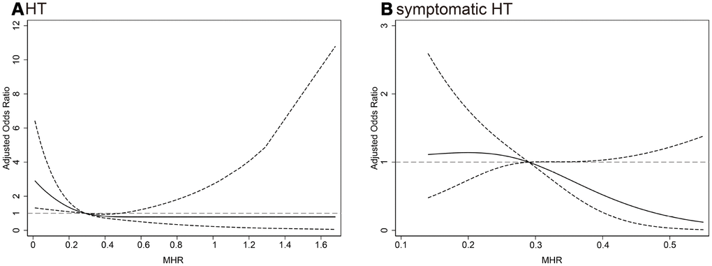 In the present study, the incidence of HT was 15.2%, which fell within the broad range of 7.5% - 49.5% reported in previous studies [2–5]. The low rate of symptomatic HT (2.5%) could be explained by the inclusion of a non-selected cohort of consecutive patients regardless of whether thrombolysis/thrombectomy is performed. Nevertheless, we confirmed the established predictive factors of HT that are evident in studies focusing on reperfusion therapies. These factors included age, atrial fibrillation, greater NIHSS score, large infarct size, increased WBC counts and decreased low-density lipoprotein cholesterol [18–20]. Moreover, when stratified by reperfusion treatment, we observed no statistically significant difference in the association of MHR with HT, suggesting generalizability of our results.