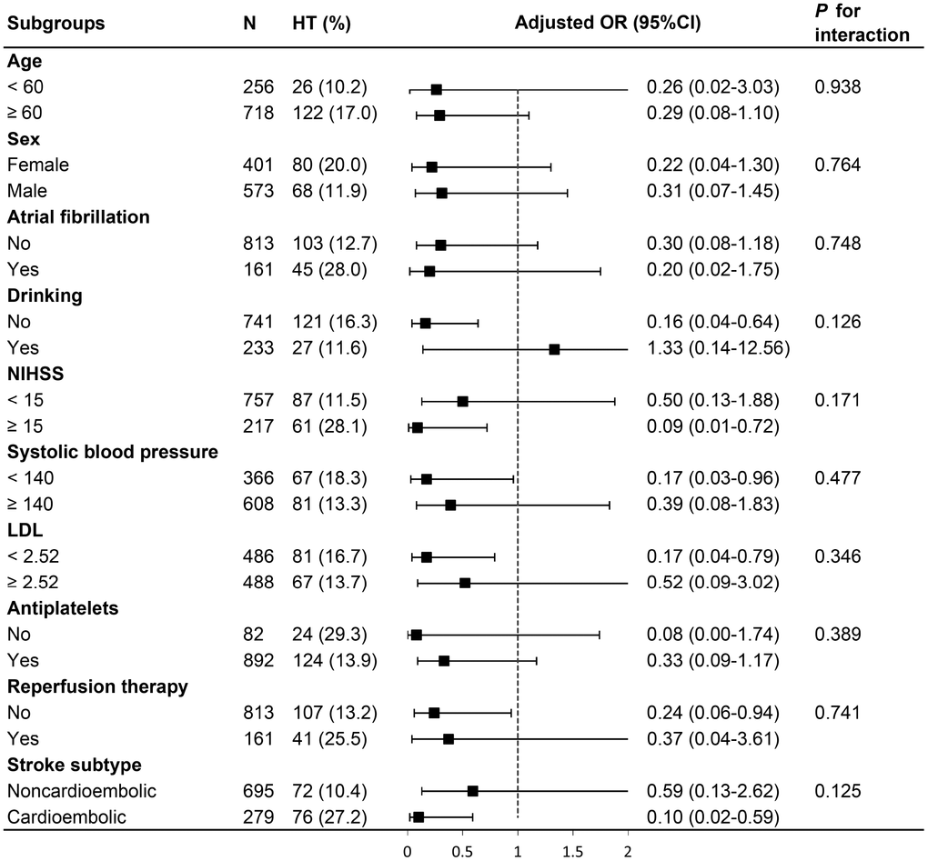A total of 148 (15.2%) patients developed HT and 24 (2.5%) patients experienced symptomatic HT. In comparison to patents without HT, those with HT were significantly older (70.7 ± 12.5 vs. 66.8 ± 13.8, P = 0.001) and contained a significantly smaller proportion of males (45.9% vs. 61.1%, P < 0.001). HT group comprised a higher frequency of atrial fibrillation (30.4% vs. 14.0%, P < 0.001) and large infarct size (60.8% vs. 15.9%, P < 0.001) as well as significantly higher NIHSS score on admission (14 vs. 5, P < 0.001). In addition, patients with HT had lower values of systolic blood pressure (143 ± 23 vs. 148 ± 24 mmHg, P = 0.009), monocyte count (0.32 vs. 0.36, P = 0.016), triglyceride (1.09 vs 1.34 mmol/L, P < 0.001) and low-density lipoprotein cholesterol (2.46 vs. 2.54 mmol/L, P = 0.032), but had higher HDL (1.32 vs. 1.22 mmol/L, P = 0.008). HT group was less likely to receive antiplatelets (83.8% vs. 93.0%, P < 0.001) and lipid-lowering agents (86.5% vs. 93.2%, P = 0.005), but more likely to receive thrombolysis (16.2% vs. 9.0%, P = 0.007) and thrombectomy (15.5% vs. 6.4%, P < 0.001).
