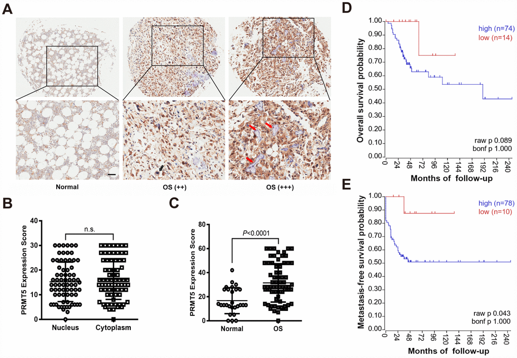 Tissue microarray (OS208) containing samples of normal bone and various grades of OS were obtained from Alenabio (Alenabio, Shanxi, China) and used for IHC with an antibody against PRMT5 (79998, 1:400, CST, MA, USA). A total of 34 OS sections were collected from patients at the First Affiliated Hospital of Jinan University and the Third Affiliated Hospital of Sun Yat-sen University. Briefly, paraffin sections were deparaffinized in xylene and rehydrated through graded ethanol washes (100%-70%, v/v), followed by incubation with 3% hydrogen peroxide for 10 min. Antigen retrieval was performed by heating slides in 10 mM Tris-HCl (pH = 10) for 15 min in a microwave. After three washes with phosphate-buffered saline (PBS) containing 0.1% Tween 20 (PBST), slides were blocked in 5% nonfat milk in PBST at room temperature (RT) for 1 h. Slides were incubated with primary antibody against PRMT5 at 4°C overnight, followed by three washes with PBST and incubation with HRP-conjugated anti-rabbit secondary antibodies at RT for 1 h. The signal was developed with diaminobenzidine for 10 min, and sections were counterstained with hematoxylin. Another set of 11 OS fresh sections was used for IHC to correlate the expression of PRMT5 and Ki67 (IS62630-2, Dako, Glostrup, Denmark). Semiquantitative analysis of PRMT5 expression was performed as previously described [17].