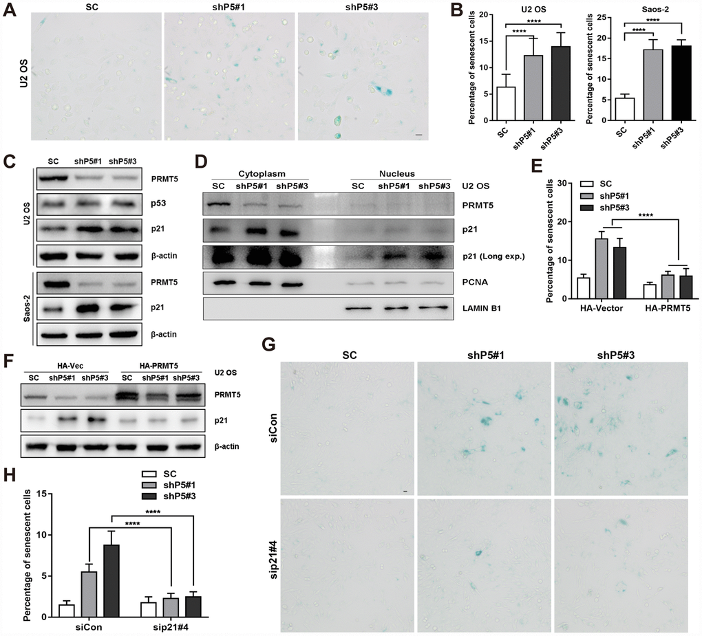In contrast, overexpression of PRMT5 by transiently transfection of the plasmid encoding HA-PRMT5 markedly reduced the percentage of senescent cells and the expression of p21 triggered by PRMT5 depletion, indicating the specific role of PRMT5 in regulating cellular senescence (Figure 2E and 2F, Supplementary Figure 2J). To explore whether p21 expression is essential for PRMT5 knockdown-triggered cellular senescence, we combined the application of the siRNA to interfere with the p21 expression (Supplementary Figure 2K). The knockdown of p21 significantly reduced the percentage of SA-β-gal stained-senescent cells in shP5 cells (Figure 2G and 2H). Altogether, these results consistently support a crucial role of PRMT5 in regulating p21 expression and thus the cellular senescence in OS.