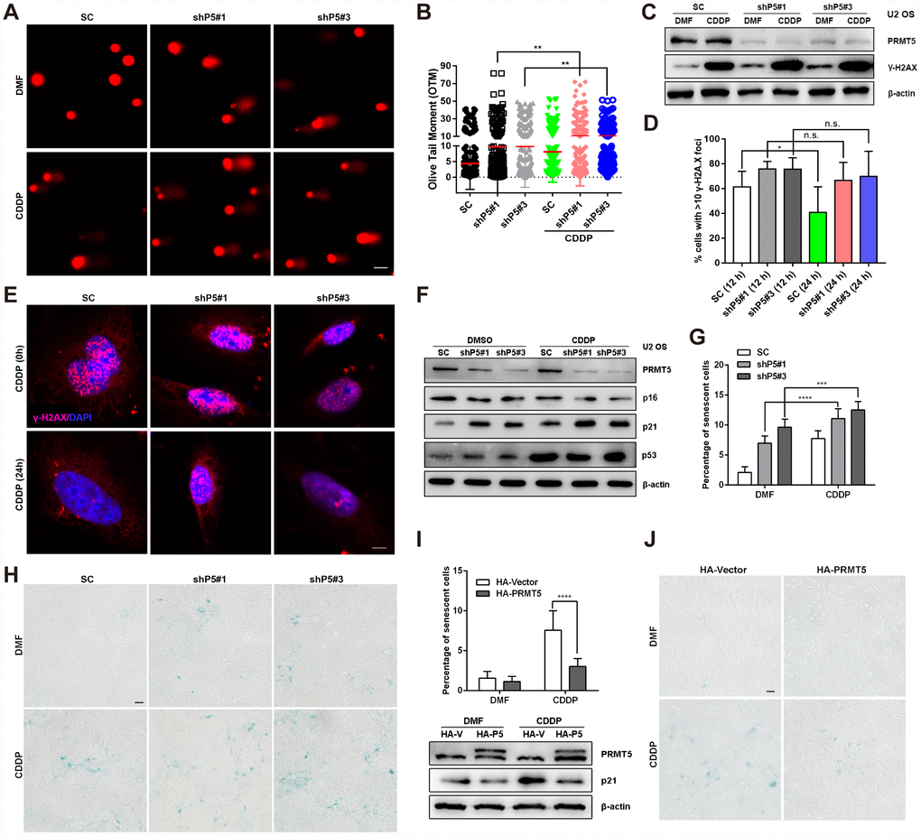 Recent studies have suggested that induction of cellular senescence is a promising strategy for enhancing therapeutic efficacy in various cancers, including OS [23, 25, 40]. We then explored whether PRMT5 plays a role in regulating senescence of OS cells with or without the DNA damaging stress elicited by the most common first-line chemotherapeutic drug, CDDP. Several lines of evidence supporting the fact that PRMT5 is essential for regulating CDDP-induced OS cell senescence: firstly, at the basal level, PRMT5 knockdown significantly increases the number of senescent cells in OS and induces the SASPs gene expression, through a mechanism involving p21 expression; while ectopic expression of PRMT5 suppresses PRMT5 knockdown-induced cellular senescence. Our finding is in according to a recent study elucidating that PRMT5 mediates the activation of Akt and ERK in glioblastoma neurosphere cells by regulating PTEN expression and ultimately participates in cellular senescence [18]. Secondary, although CDDP has been demonstrated to induce cancer cells into senescence through sequential activation of the DNA damage response and the p53/p21 pathway in the literature [20, 35], and in our hands, knockdown of PRMT5 was found to further promote CDDP-induced p21 expression and senescent OS cells, while PRMT5 overexpression remarkably diminished CDDP-induced p21 protein level and senescent cells. Thirdly, since DNA damage is the most important inducer of cellular senescence [41–43], we also reveal the possible mechanism demonstrating that PRMT5 plays a crucial role in regulating DSBs and DDR at either basal level or in CDDP-treated levels. This result is consistent with our recent publication reporting that PRMT5 functions as a master epigenetic activator of DDR genes [17]. These results together suggest that overexpression of PRMT5 may confer resistance of OS cells to CDDP by regulating cellular senescence, and that targeting the druggable PRMT5 in combination with chemotherapy may be utilized as a strategy for OS treatment.