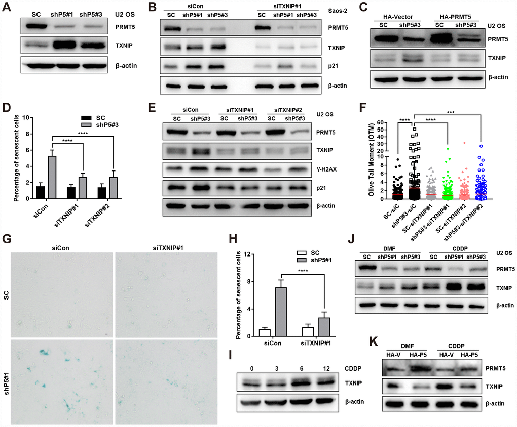 Next, we sought to identify the key factor mediating PRMT5 depletion-induced DNA damage and cellular senescence. TXNIP has recently been reported as a key regulator of oxidative stress, DNA damage, and cellular senescence [22]; thus, we explored the possible involvement of TXNIP in PRMT5 depletion-induced cellular senescence. Of significance, knockdown of PRMT5 upregulated the protein but not the mRNA expression level of TXNIP in the U2 OS cells (Figure 4A, Supplementary Figure 3A). A similar result was obtained using another OS cells, Saos-2 (Figure 4B). In contrast, overexpression of PRMT5 by transfecting the plasmid encoding HA-PRMT5 markedly abolished the induction of TXNIP by shP5#3 (Figure 4C). Since cytoplasmic TXNIP has been demonstrated to be highly correlated with cellular senescence [37], we also explored its localization and found that PRMT5 depletion led to a marked increase of both cytoplasmic and nuclear TXNIP (Supplementary Figure 3B and 3C). Functionally, knockdown of TXNIP by two different small interfering RNAs (siRNAs, siTXNIP#1 and siTXNIP#2) significantly reduced the percentage of senescent cells resulting from PRMT5 depletion (Figure 4D, Supplementary Figure 3D). In agreement with this finding, siTXNIP#1 and siTXNIP#2 also greatly suppressed the induction of p21 as well as the DSBs caused by shP5#3 (Figure 4E and 4F, Supplementary Figure 3E). Similarly, interfering TXNIP by siTXNIP#1 also remarkably reduced the percentage of SA-β-gal stained-senescent cells and the induction of p21 elicited by another shRNA of PRMT5, shP5#1 (Figure 4B, Figure 4G and 4H, Supplementary Figure 3F). Notably, we found that the treatment of OS cells with CDDP induced TXNIP expression at a time of 6 and 12 h, and this induction of TXNIP was enhanced upon PRMT5 depletion by shP5#1 and shP5#3, while suppressed by PRMT5 overexpression (Figure 4J, 4K). These results together suggest that TXNIP acts as a key factor mediating PRMT5 depletion-induced DNA damage and cellular senescence.
