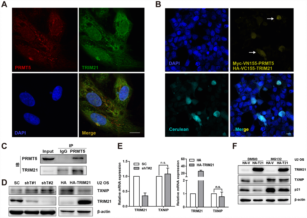 It is well characterized that PRMT5 plays a key role in regulating transcription via methylating histone or non-histone substrates [7]. Given that PRMT5 has a marginal effect on the transcription of TXNIP and p21, we then hypothesized that PRMT5 might regulate TXNIP protein expression in an indirect manner, e.g., via modulating protein-protein interaction. We have previously identified TRIM21 as a potential interacting partner of PRMT5 by mass spectrometry in prostate cancer cells [11]. Next, we sought to assess whether TRIM21 is necessary for PRMT5-regulated TXNIP and p21 expression. Of significance, PRMT5 and TRIM21 were colocalized in the cytoplasm in U2 OS cells (Figure 5A), and bimolecular fluorescence complementation (BiFC) assay, an imaging method for visualization of protein-protein interactions in living cells [38, 39], confirmed their interaction in the U2 OS cells (Figure 5B). The interaction between PRMT5 and TRIM21 was further validated by the coimmunoprecipitation (co-IP) assay (Figure 5C). Thus, these results demonstrate that PRMT5 interacts with TRIM21 in the U2 OS cells. Next, shTRIM21 stable cells or doxycycline (Dox)-inducible H125-TRIM21 expressing cells were established for further studies. As shown in Figure 5D and 5E, knockdown of TRIM21 negatively regulated the expression of TXNIP at the protein level but not at the mRNA level. In contrast, overexpression of TRIM21 significantly attenuated TXNIP protein level without an obvious effect on TXNIP transcription (Figure 5D and 5E). In addition, the treatment of MG132 (proteasome inhibitor) partially restored TXNIP (p21 as positive control) expression even in the presence of HA-TRIM21 (Figure 5F). These results suggest that TRIM21 can post-translationally regulate the expression of TXNIP.