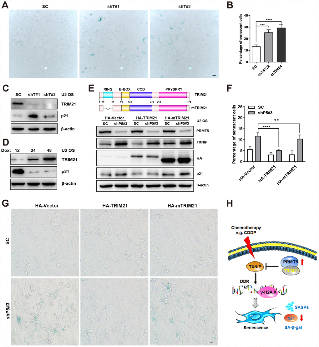 Next, we aimed to explore the possible role of TRIM21 in PRMT5 depletion-regulated TXNIP/p21 axis in the U2 OS cells. As shown in Figure 6A–6C, knockdown of TRIM21 increased the percentage of senescent cells, accompanied by a significant induction of p21 expression. Conversely, enforced expression of TRIM21 by Dox induction markedly decreased p21 expression (Figure 6D). Further, we investigated the functional domain of TRIM21 in regulating TXNIP/p21 expression and the OS cell senescence. As shown in Figure 6E, overexpression of HA-TRIM21 remarkably attenuated the induction of TXNIP and p21 in the shP5#3 cells. Nevertheless, a comparable expression of TXNIP and p21 in the SC and shP5#3 cells was observed either by transfecting the cells with the HA-Vector or HA-mTRIM21, a RING domain deleted mutant which lacks E3 ubiquitin ligase activity (Figure 6E). Consistently, overexpression of HA-TRIM21 but not HA-mTRIM21 remarkably abolished PRMT5 knockdown-induced cellular senescence (Figure 6F and 6G). Taken together, our results suggest that TRIM21 functional interacting with PRMT5 is involved in the regulation of the TXNIP/p21 axis, and the DNA damaging agent-induced cellular senescence (Figure 6H).