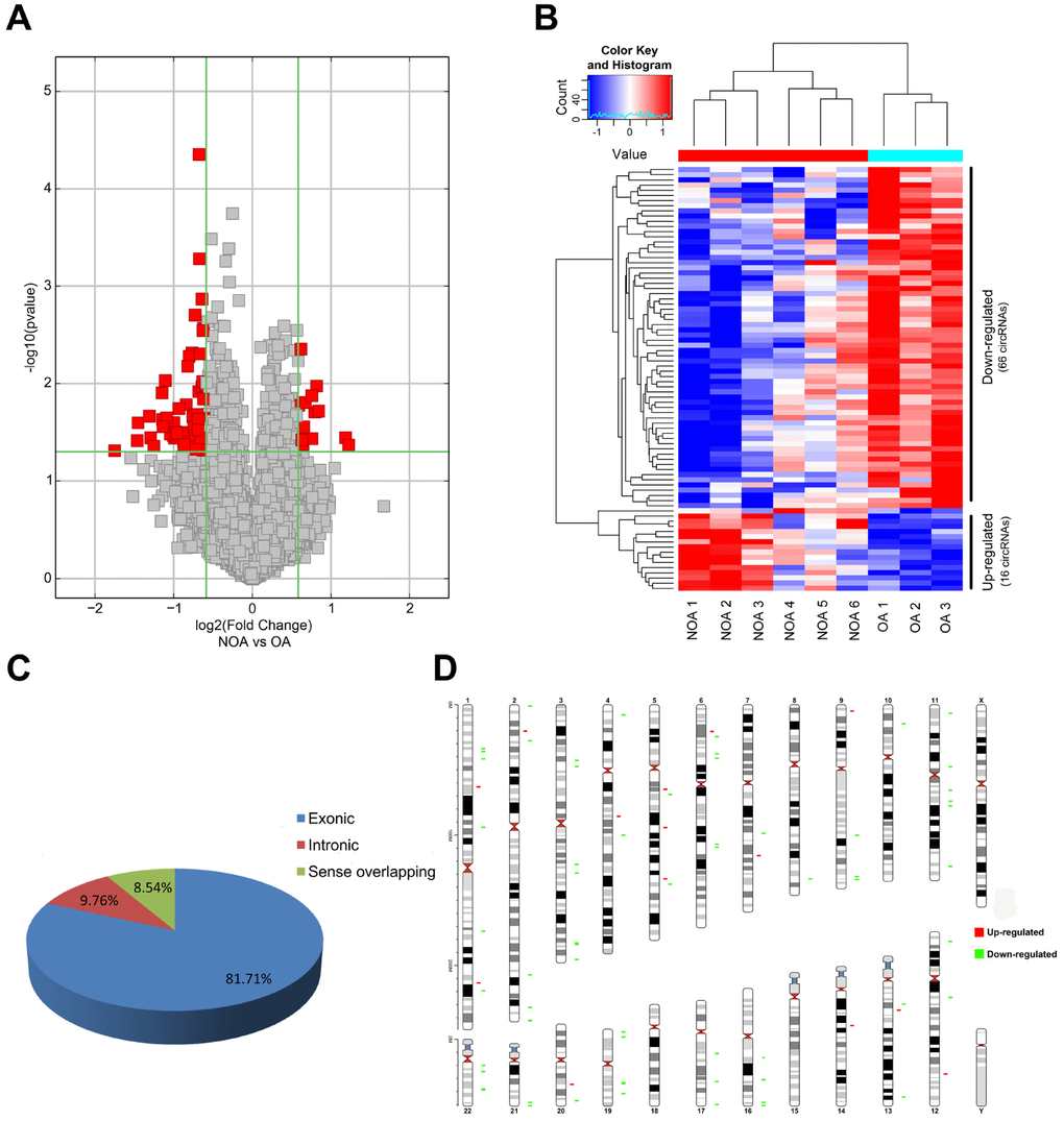 We performed microarray-based profiling analyses to screen the differentially expressed circRNAs in 6 NOA and 3 OA tissues. The box plot depicts similar distributions of the intensities from all the normalized datasets (Figure 1A). Raw variation of circRNA expression between the two groups is shown in the scatter plot (Figure 1B). Volcano plots and hierarchical clustering exhibit the differentially expressed circRNAs between the NOA and OA samples (Figure 2A and 2B). Using a threshold of fold change (FC) ≥ 1.5 and a p-value < 0.05, we identified 82 differentially expressed circRNAs, of which 16 were up-regulated and 66 were down-regulated in NOA tissues compared with OA tissues (Table 1 and Table 2). According to the annotation of human circRNAs, we found 81.71% of the dysregulated circRNAs were exonic circRNAs, 9.76% were intronic circRNAs and 8.54% were sense overlapping circRNAs (Figure 2C). Further analysis revealed that these dysregulated circRNAs were mostly distributed on chr1, chr2, chr3, chr4, chr5, chr6, chr7, chr8, chr9, chr10, chr11, chr12, chr13, chr14, chr16, chr17, chr19, chr20, chr21 and chr22, but not on chr15, chr18, chrX and chrY (Figure 2D).