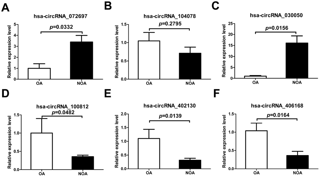 To further confirm the results of circRNA microarray, we chose six dysregulated circRNAs at random, including three down-regulated (hsa_circRNA_402130, hsa_circRNA_100812 and hsa_circRNA_406168) and three up-regulated (hsa_circRNA_072697, hsa_circ RNA_104078 and hsa_circRNA_030050). qRT-PCR in NOA and OA samples showed that the expression of hsa_circRNA_072697, hsa_circRNA_402130, hsa_ circRNA_100812, hsa_circRNA_030050 and hsa_circ RNA_406168 was consistent with the microarray data. And the difference in expression of hsa_circ RNA_072697, hsa_circRNA_030050, hsa_circRNA_ 100812, hsa_circRNA_402130 and hsa_circRNA_406168 was statistically significant (Figure 3A, 3C, 3D, 3E, 3F, p=0.0332, p=0.0156, p=0.0482, p=0.0139, p=0.0164). The expression of hsa_circRNA_104078, however, did not follow the microarray and was not statistically significant (Figure 3B, p=0.2795).