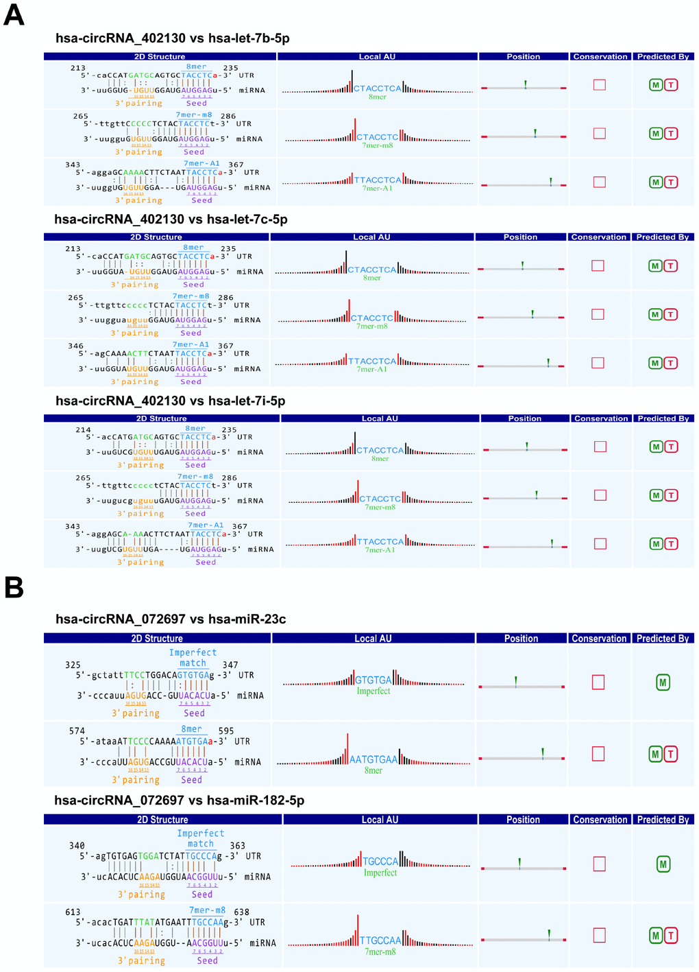 Several studies have demonstrated that circRNAs regulate the expression of their target genes by competing with their target miRNAs for binding [8, 20, 21]. The Arraystar’s homemade miRNA target prediction software based on TargetScan and miRanda was utilized to predict the circRNA-microRNA interactions of two confirmed circRNAs (hsa_circRNA_402130 and hsa_circRNA_ 072697). The top 5 targeted miRNAs were then identified based on the miRNA support vector regression (mirSVR) scores. Studies have shown that some NOA-related miRNAs are dysregulated in the testicular tissues of patients with NOA [22, 23]. So we selected the the potential miRNAs shared by the software and the reports to construct circRNA–miRNA interactions. The 2D structure was created from the sequence analysis of microRNA response elements (MREs) (Figure 4A and 4B). For hsa_circRNA_402130, the potential miRNA targets included hsa-let-7b-5p, hsa-let-7c-5p and hsa-let-7i-5p, and for hsa_circRNA_072697 the miRNA included hsa-miR-23c and hsa-miR-182-5p.