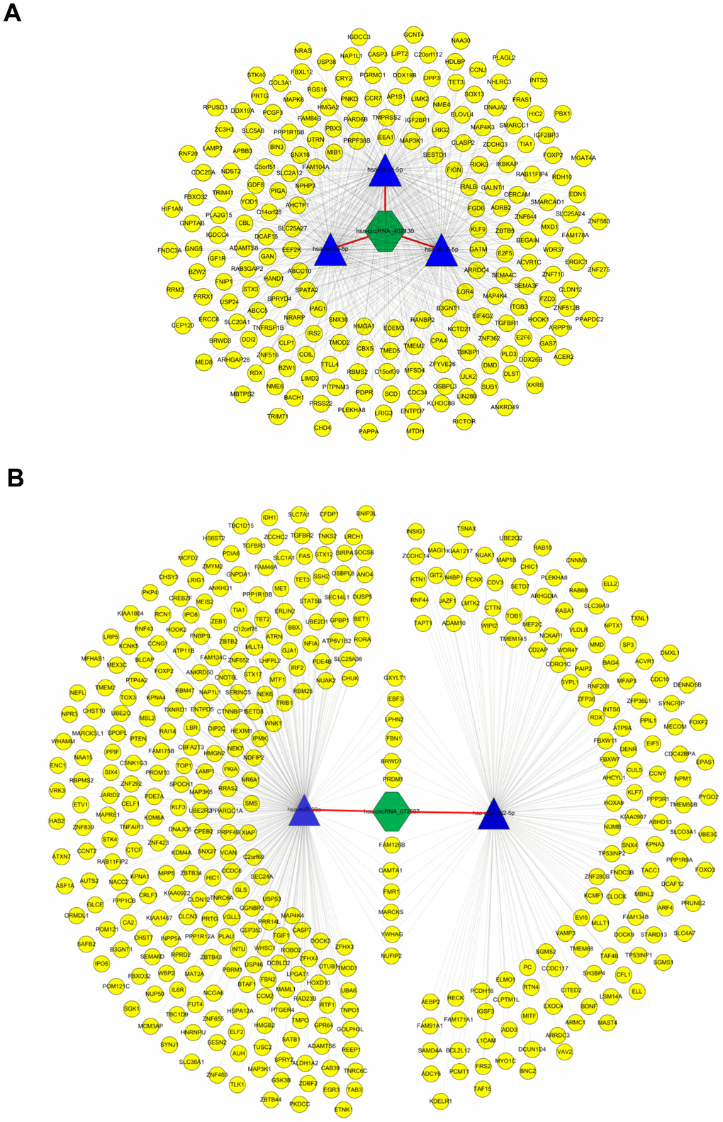 To dissect out the functions of the two validated circRNAs, starBase v2.0 and miRDB identified down-stream target genes of the abovementioned candidate miRNAs. The two circRNA-miRNA-mRNA regulatory networks (built by OmicShare tools) included 3 miRNAs and 212 mRNAs in the ceRNA network of hsa_circRNA_402130 (Figure 5A, Supplementary Table 1), and 2 miRNAs and 411 mRNAs in the ceRNA network of hsa_circRNA_072697 (Figure 5B, Supplementary Table 2). As shown in Figure 5A, we found that this network contains multiple transcription factors such as HMGA2, SOX13, E2F5, LIN28B and so on. Similarly, multiple transcription factors such as FOXO3, FOXP2 and SP3 are included in the regulatory network of Figure 5B. These regulatory networks revealed that circRNAs may play a crucial part in the process of NOA.