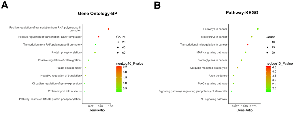 The functions of all the target genes were analyzed by online biological classification tool DAVID. The top 10 GO terms and KEGG terms are displayed as bubble diagram. The GO biological process (BP) analysis (Figure 6A) showed that the target genes were significantly enriched in positive regulations including transcription from RNA polymerase II promoter, transcription, cell migration, protein phosphorylation, palate development, pathway-restricted SMAD protein phosphorylation, circadian regulation of gene expression. KEGG pathway analysis (Figure 6B), showed target genes were enriched for microRNAs in cancer, MAPK signaling pathway, signaling pathways regulating pluripotency of stem cells, FoxO signaling pathway, ubiquitin mediated proteolysis, axon guidance, transcriptional misregulation in cancer, proteoglycans in cancer and TNF signaling pathway. These findings imply that circRNAs might participate in the development of NOA through multiple signaling pathways.