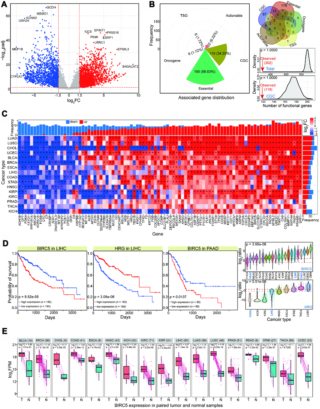 Our CCA sample sizes were insufficient to perform prognostic analysis. Therefore, to investigate the potential relationship between abnormally expressed genes and prognosis, we selected some genes and performed survival analysis in cancer types related to CCA. These mainly included liver hepatocellular carcinoma (LIHC) and pancreatic adenocarcinoma (PAAD). The molecular pathogenesis of CCA is similar to that of hepatocellular cancer, and some dominant risk factors are associated with both cancer types. Moreover, transcriptome analysis has confirmed some common genomic features between the two cancer types [12–14]. These deregulated genes, including BIRC5 and HRG (histidine-rich glycoprotein), may be correlated with prognosis, although they show dynamic expression across diverse tissues (Figure 1D). BIRC5 was upregulated in intrahepatic cholangiocarcinoma, and may contribute to the development of diagnostic and therapeutic strategies [15]. Another gene, HRG, was significantly deregulated in intrahepatic cholangiocarcinoma and may inhibit tumor growth and metastasis [16]. Furthermore, to validate the expression patterns of BIRC5 and HRG across individuals, paired samples were used to present their expression patterns. The results of paired analysis indicated that the expression of these genes was relatively stable (Figure 1E and Supplementary Figure 1F), while significant expression differences were observed across diverse cancer types. Based on current sample distributions, these results further validate that differential analysis produces stable results.