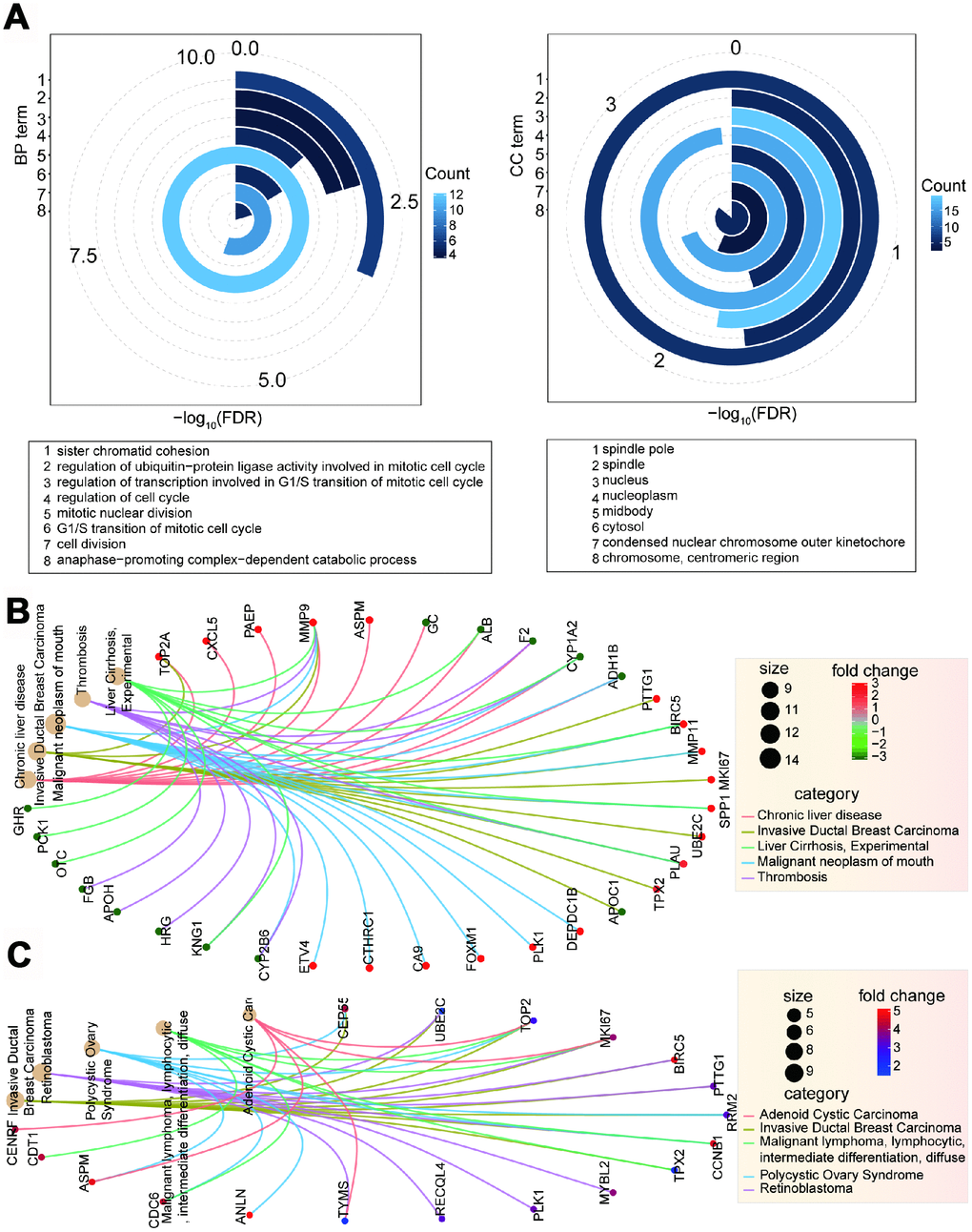 To understand the complex association between these screened genes and other disease types, we predicted the potential associations of gene sets and diseases. Using the 94 genes deregulated in CCA, we found that several disease types were enriched. These include malignant neoplasm of mouth, invasive ductal breast carcinoma, chronic liver disease, thrombosis, and liver cirrhosis (Figure 3B). Some diseases were also enriched for the 26 identified genes, including invasive ductal breast carcinoma, retinoblastoma, and polycystic ovary disease (Figure 3C, Supplementary Figure 2C and 3A). Although there were 15 common genes in both of these gene sets, only invasive ductal breast carcinoma was the common enriched disease type. We further queried the roles the filtered 26 genes in multiple biological processes (Supplementary Figure 2C and 3A, 3B). Some of these genes were crucial nodes in the cell cycle pathway, could be enriched in several significant GO terms, and some were related with other disease types. Taken together, these results provide evidence for their roles in basic biological and pathophysiological processes, especially in tumorigenesis, and support their potential in targeted cancer therapy.