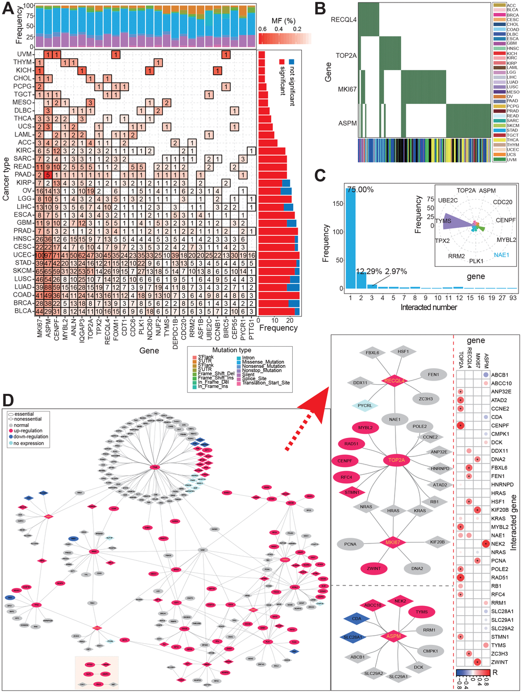 We analyzed the mutation profile of these screened genes across 33 cancer types, and identified mutated sites in many cancers (Figure 4A and 4B). In eight cancer types, mutations in all 26 genes were detected in patients. However, in patients with CCA, mutations were identified in only four genes: MKI67, ASPM, TOP2A, and RECQL4 (Figure 4B). This may be a function of the small CCA sample size in this study. Mutation profiles in other cancer types, with larger sample sizes, were sufficient to show the mutation trends of these genes and their potential association with the occurrence of cancer (Figure 4B and Figure 4B).