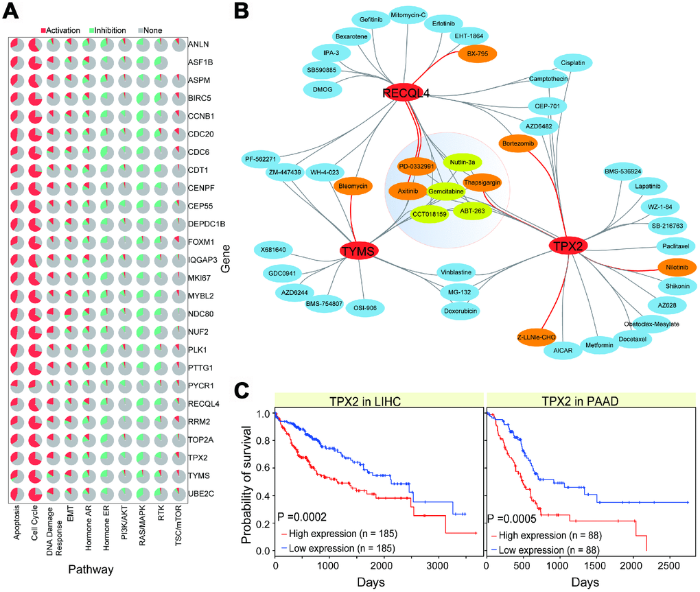 To understand the potential relevant cancer pathway roles of the 26 screened genes, we performed the relevant analysis using GSCALite [31]. This analysis allows us to predict activation or inhibition roles in cancer-related biological pathways. We found that most of these genes showed consistent roles in relevant pathways, including activation roles in cell cycle and apoptosis pathways, and inhibition roles in RAS/MAPK and hormone ER pathways (Figure 5A). These results indicate that these genes are crucial in diverse biological processes, and that their abnormal expression may lead to the activation or inhibition of normal biological pathways. Specifically, CDC20 was associated with apoptosis (Supplementary Figure 3D), indicating that it contributes to the cellular apoptosis process. The functional role of CDC20 has been reported in the cell cycle, proliferation, and apoptosis [32, 33], and it may present a potential novel cancer therapeutic strategy as a candidate target [34]. Our results indicate that these candidate genes are always abnormally enriched in cancer samples, and are prone to over-expression (Figure 2), implying a potential correlation between their abnormal expression and cancer processes.