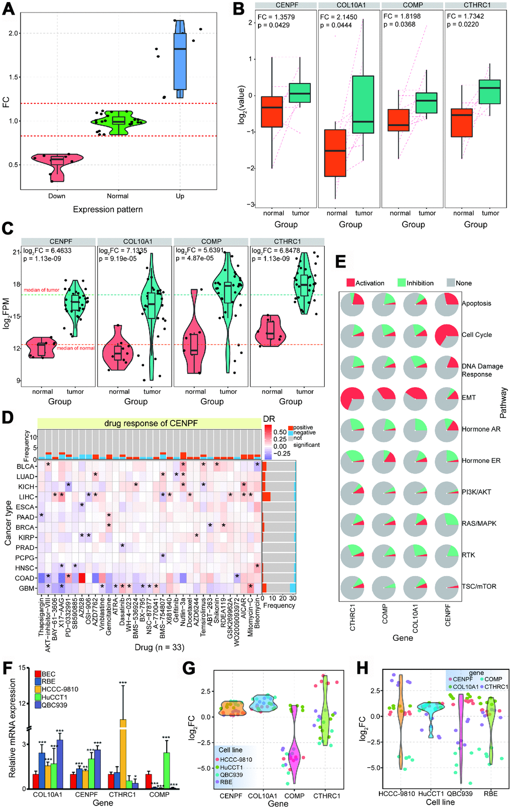First, the expression profiles of 94 abnormally expressed genes were queried, and 39 showed high enrichment levels (Figure 6A). Then, examination of the 26 upregulated genes revealed that four of them were identified as upregulated proteins that were consistent with mRNA expression result (Figure 6B and Figure 6C). Over-expression of these four genes at both mRNA and protein levels verified their roles in the carcinogenic process, and further drug analysis (based on diverse cancer types) verified that CENPF may be a potential drug target (Figure 6D). These four genes have important roles in biological pathways, including activation roles in EMT pathways, and CENPF has significant activation roles in apoptosis, cell cycle, and DNA damage response (Figure 6E and Supplementary Figure 4E).