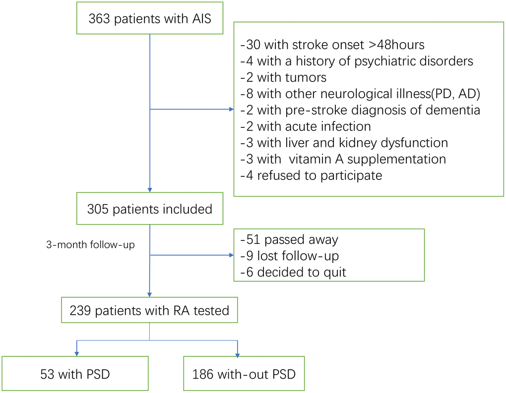 Nucleus accumbens shell is crucial for depression and one study reported that RA signaling pathway was enhanced in this region [13], which influenced on the emotional behavior, such as depression and anxiety [14]. Accumulating studies have showed an association between RA and depression development [15–17]. However, the relationship between RA and PSD has not elucidated. We conducted a prospective single-center cohort study on patients with acute ischemic stroke (AIS) for evaluating the relationship between RA serum levels and PSD, and the clinical significance of RA was also compared with other known PSD indicators.