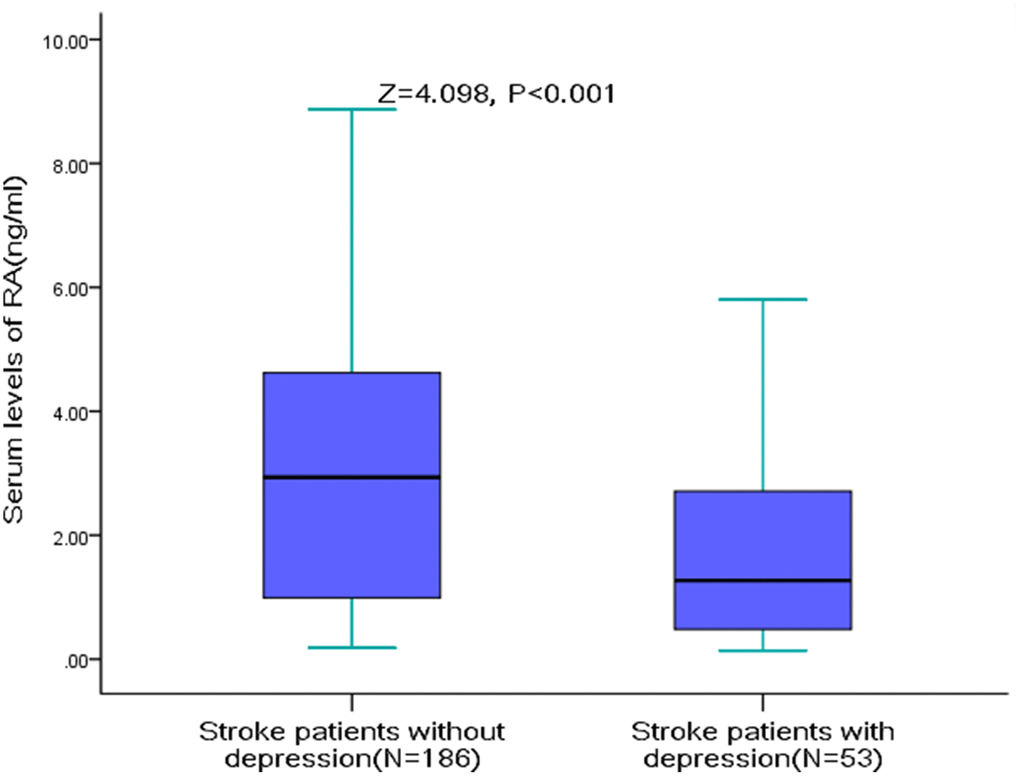 In conclusion, reduced RA serum level was correlated to higher risk of 3-month depression in AIS patients, suggesting that RA may be a promising predictive biomarker for PSD. This may be used for improving prediction of depression and assignment of effective treatment for stroke in the future.