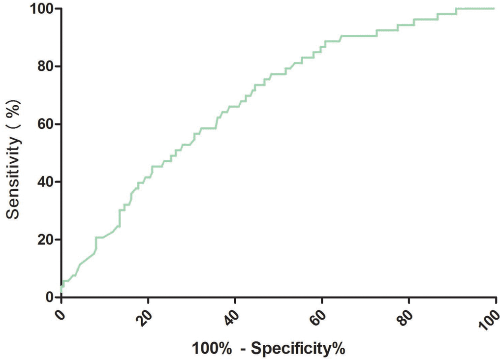 The cut-off value of RA for predicting PSD was calculated from ROC curves. When the RA serum level was 2.8ng/ml, the AUC was 0.69 (95% CI, 0.61-0.76), providing a best sensitivity of 77.4% and specificity of 51.6% (Figure 3). RA presented a better discriminatory ability than that of age (AUC, 0.58; 95%CI, 0.50-0.64; P=0.001), sex (AUC, 0.55; 95%CI, 0.47-0.61; P<0.001) and was within the range of the NIHSS score (AUC, 0.71; 95%CI, 0.63-0.78; P=0.42). In addition, RA was superior to other serum indicators, including Hs-CRP (AUC, 0.62; 95% CI, 0.56–0.69; P=0.006), HCY (AUC, 0.63; 95% CI, 0.58–0.70; P=0.012), and glucose (AUC, 0.52; 95% CI, 0.42–0.58; P<0.001). A multivariate model was constructed with reduced levels of RA (