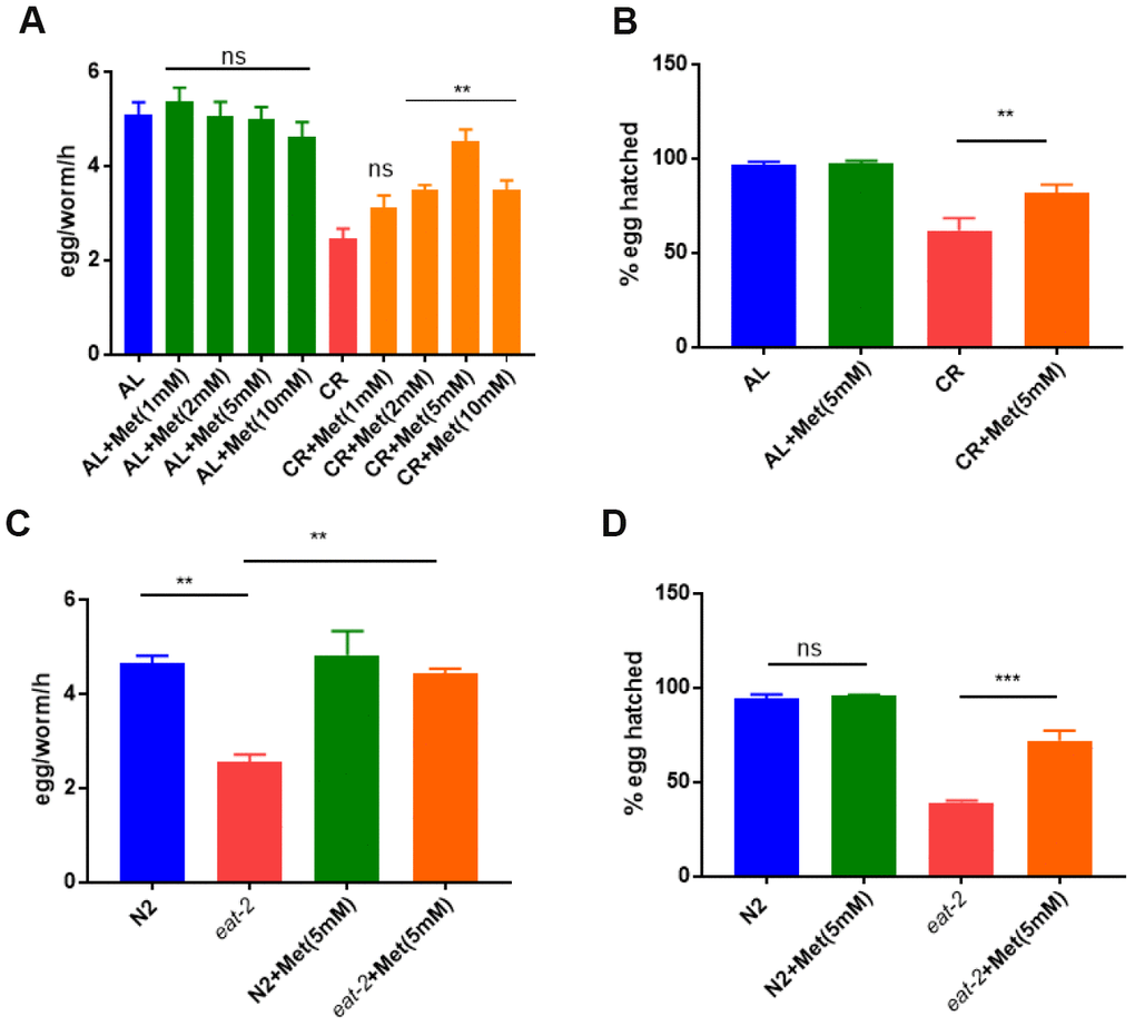 Considering the important and specific roles of methionine in nutrient metabolisms, we were interested to know if methionine could mitigate the reproduction defect caused by calorie restriction. Calorie restriction is known to reduce offspring numbers in many organisms [34], a side effect that could be conserved in mammals. To understand the roles of methionine in growth and reproduction under CR/DR condition, we used CR/DR strategies established early in C. elegans [35]. To calorie restrict the animals, we diluted bacteria and cultured worms from L1 larvae stage on nematode growth (NG) medium plates supplemented with various concentrations of methionine (0, 1, 2, 5 and 10 mM). We found that CR/DR robustly reduced total egg production, which however was rescued by supplementing methionine at 2, 5, and 10 mM, with 5 mM achieving the best rescue (Figure 1A). To test if the rescue effect was specific to methionine, we also added cysteine, a sulfur-containing amino acid similar to methionine, and another 2 essential amino acids, threonine and leucine. However, at concentrations ranging from 1 to 10 mM, no rescue effect was observed for cysteine, threonine and leucine (Supplementary Figure 1). We also tested the cysteine precursor n-acetyl-cysteines (NAC), which has high water solubility. As shown in Supplemental Information Supplementary Figure 2, NAC slightly improved the egg production in both control and CR/DR groups in a dose-dependent manner, suggesting that NAC has no specific function in the CR/DR pathway. Second, we examined the effect of methionine on egg hatching. CR robustly decreased the egg hatching rate. Interestingly, such detrimental effect of CR was significantly mitigated by 5 mM methionine (Figure 1B). To confirm the observations, we also conducted similar experiments by using eat-2(ad1116) mutant. The eat-2 mutant has a reduced pharyngeal pumping rate, hence reduced food uptake, which makes it a widely-used CR/DR model [36]. Consistently, defect in egg production and hatching in eat-2 mutant were significantly improved by methionine (Figure 1C and 1D).