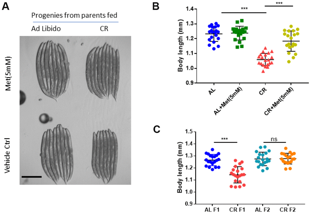 We also asked if progenies from the calorie-restricted animals could be defect in development and whether methionine can rescue such defect. To test this, we calorie restricted the parental animals from L1 stage as before and collected eggs within 3 hours to obtain age-synchronized progenies. Grown on normal NG medium with Ad libido OP-50 bacteria food, the progenies of calorie-restricted parents appeared to be smaller than controls (Figure 2A, 2B). Interestingly, adding methionine almost completely reversed the small body size. The slow growth phenotype only occurred transiently, as it disappeared in the second (F2) generation (Figure 2C).