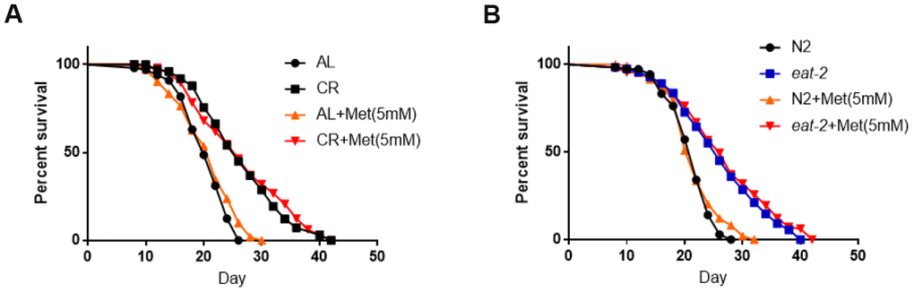 For lifespan assay in C. elegans, gravid worms were allowed to lay synchronized eggs on AL and CR plate supplemented with or without 5mM methionine for 2 hours (5 worms per plate). Eggs were allowed to hatch at 20°C young adulthood and worms were transferred to new plates every day to keep contamination by progenies. Lifespan were started from day-8 of adulthood by counting the survival and dead worms every other day. Worms with explosion, bagging and protruding vulva were censored. Death was defined by lack of any visible movement for 5 seconds after touching the tail. Lifespan data were also shown in Supplemental Information (SI). Lifespan assays were performed at different time for 3 times and pooled together to be plotted and analyzed with GraphPad Prism software.