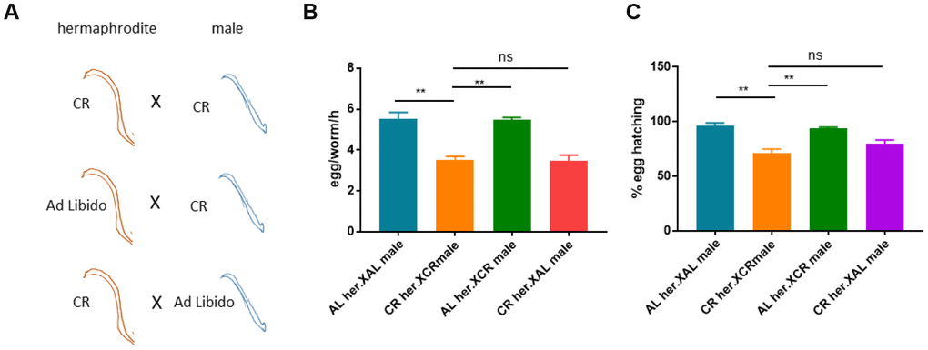 Mating was conducted by raising 5 males and 5 hermaphrodites at young adult stages on NG agar medium plate with a tiny spot of OP-50 bacteria (mating plate). To obtain age-matched CR males and hermaphrodites, hermaphrodites mated for 1 day were transferred to CR and AL plates to lay synchronized eggs for 2 hours. Eggs were allowed to hatch and develop to L4 larvae. Age-matched males and hermaphrodite were picked for mating on mating plate according to the combinations shown in Figure 4A.