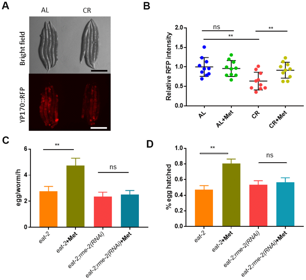 Next, we asked if yolk proteins were required for the methionine to rescue the reproductive defect of CR animals. Yolk proteins are made in the intestine and transported into the oocyte to support embryonic growth and survival. Yolk proteins uptake by oocytes requires endocytosis mediated through RME-2 [40]. We found that RNAi knockdown of rme-2 expression in the eat-2 CR model animals prevented methionine from improving egg production (Figure 5C) and hatching rate (Figure 5D). These results suggest that increased yolk production and transport into the oocyte is required for methionine to improve the impaired reproduction of CR animals.