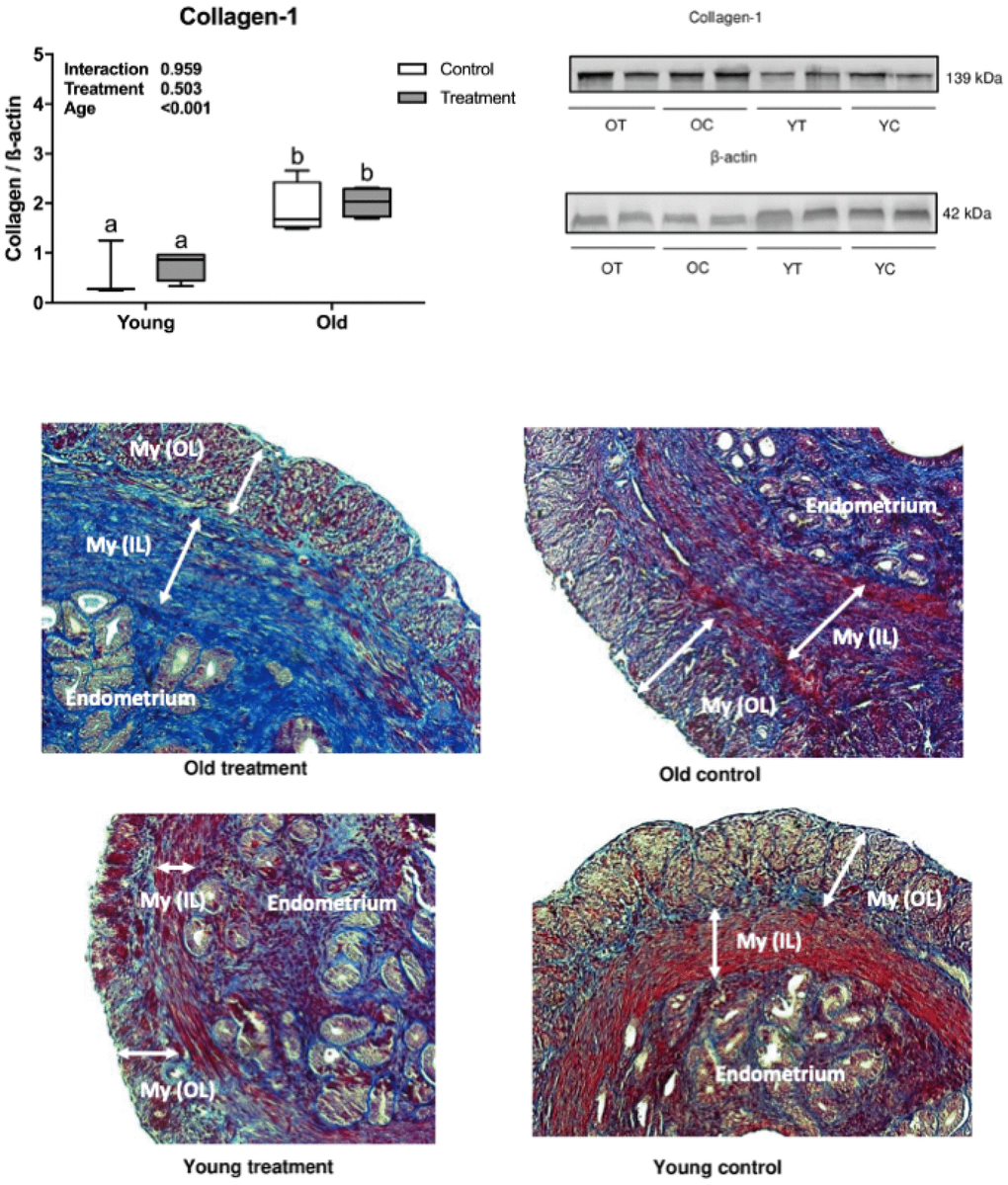 Collagen deposition (fibrotic process) was observed in the muscular and endometrial uterine layers in histological analyses using Masson’s trichrome staining and confirmed by the presence of type 1 collagen in the uterine samples. Collagen deposition was significantly higher in old mice compared to young mice (age effect, P <0.001, Figure 1) and there was no difference in fibrosis in treated groups compared to placebo (treatment effect, P =0.503, Figure 1).