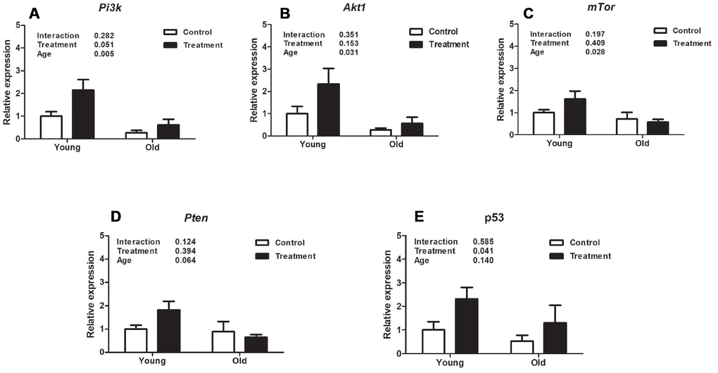 Evaluation of uterine expression of different genes related to the Pi3k/Akt1/mTor signaling pathway revealed that aging was associated with inhibition of Pi3k and its downstream mediators, Akt1 and mTor. The relative expression of Pi3k, Akt1 and mTor was significantly lower in old mice compared to young mice (P =0.005, P =0.031, P =0.028, respectively, Figure 2A–2C). However, there was no treatment effect on the expression of Pi3k, Akt1, or mTor (P=0.051, P =0.153, P =0.409, respectively, Figure 2A–2C). Regarding the gene expression of Pten, there was no effect of either treatment or age (P =0.394, P =0.064, respectively, Figure 2D). Interestingly, p53 mRNA was upregulated with the D+Q treatment compared to control groups (P =0.041, Figure 2E), while there was no aging effect (P =0.140, Figure 2E).