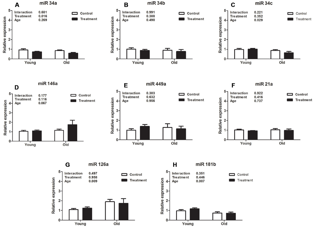 Statistical analysis was performed using GraphPad Prism 7 software (GraphPad Software Inc., La Jolla, CA, USA). Gene expression (mRNA), miRNA expression, and protein levels were compared between groups by 2-way ANOVA and p values for age, treatment, and its interaction are presented. When the interaction was significant, a multiple comparisons test was performed using Tukey’s test. Categorical variables were compared using the chi-square test. A P value lower than 0.05 was considered statistically significant.