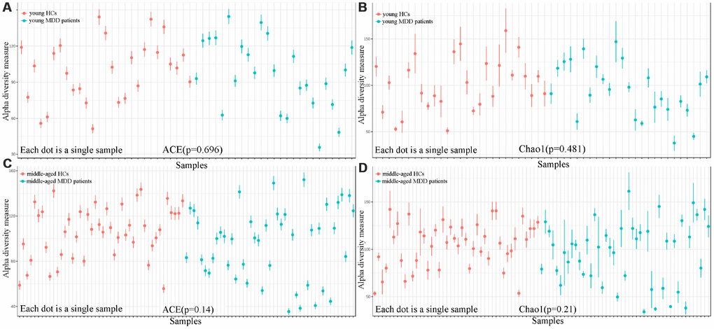 Nowadays, emerging evidence has shown the age-related changes in gut microbiota composition. For example, Firmicutes is the dominant taxa during the neonatal period, but Actinobacteria and Proteobacteria are about to increase in three to six months [17]. While in adults, Vemuri et al. reported that Bacteroidetes and Firmicutes were the dominant taxa [18]. Meanwhile, compared to younger individuals, the abundance of Bacteroidetes is significantly higher in frailer older individuals [19]. These results showed that there was a close relationship between age and gut microbiota composition. Ignoring this relationship would affect the robust of results when exploring the mechanism of action of gut microbiota in diseases. Therefore, to study the relationship between gut microbiota and MDD patients in different age groups, we recruited 52 young subjects aged from 18 to 29 years (27 healthy controls (HCs) and 25 MDD patients) and 89 middle-aged subjects aged from 30 to 59 years (44 HCs and 45 MDD patients). The main purpose of this study was to identify the age-specific differential changes on gut microbiota composition in MDD patients. Our results would display the different changes of gut microbiota composition along with age between HCs and MDD patients.