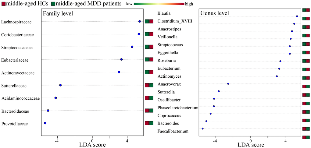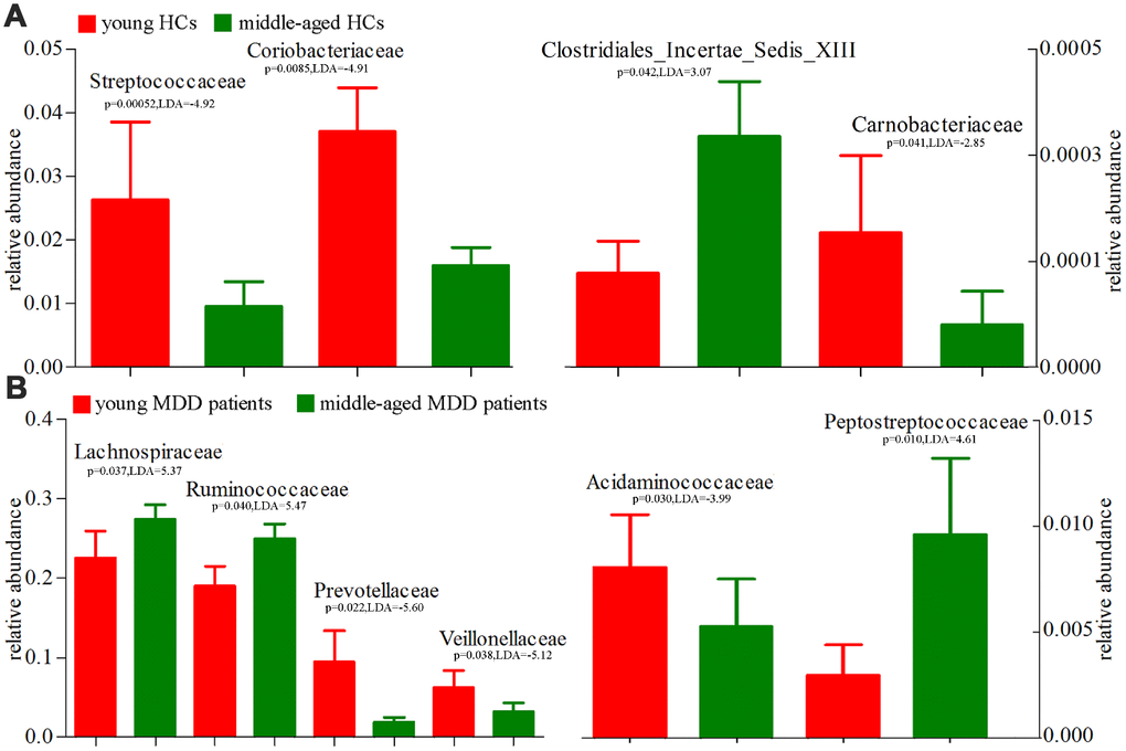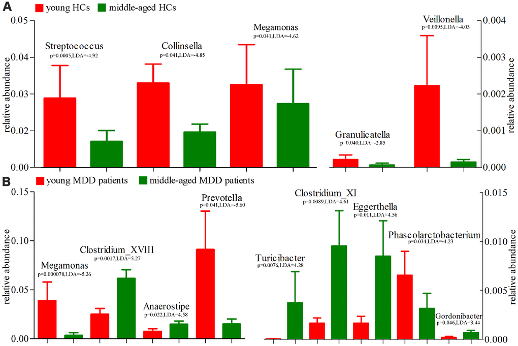 Using the LEfSe approach, we identified four differentially abundant bacterial taxa (the Family level) between young HCs and middle-aged HCs (Streptococcaceae, Coriobacteriaceae, Carnobacteriaceae and Clostridiales_Incertae_Sedis_XIII) (Figure 9A); we also identified six differentially abundant bacterial taxa (the Family level) between young MDD patients and middle-aged MDD patients (Prevotellaceae, Acidaminococcaceae, Veillonellaceae Peptostrep-tococcaceae, Lachnospiraceae and Ruminococcaceae) (Figure 9B). Meanwhile, using the LEfSe approach, we identified five differentially abundant bacterial taxa (the Genus level) between young HCs and middle-aged HCs (Streptococcus, Veillonella, Granulicatella, Collinsella and Megamonas) (Figure 10A). All these bacterial taxa were significantly decreased in middle-aged HCs; we also identified nine differentially abundant bacterial taxa (the Genus level) between young MDD patients and middle-aged MDD patients (Megamonas, Prevotella, Phascolarctobacterium, Anaerostipes, Clostridium_XVIII, Gordonibacter, Eggerthella, Clostridium_XI and Turicibacter) (Figure 10B).
