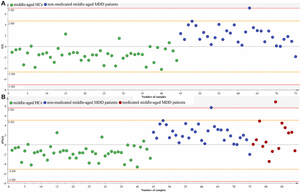To determinate the homogeneity of gut microbiota composition between medicated and non-medicated MDD patients, we firstly used the middle-aged HCs and non-medicated middle-aged MDD patients to built OPLS-DA model (Figure 11A). The results showed that 41 of the 44 middle-aged HCs and 30 of the 31 non-medicated middle-aged MDD patients were correctly diagnosed by the OPLS-DA model. Then, we used the built model to predict class membership of 14 medicated middle-aged MDD patients. The T-predicted scatter plot showed that 11 of the 14 medicated middle-aged MDD patients were correctly predicted (Figure 11B). These finding indicated that the gut microbiota composition of non-medicated middle-aged MDD patients were distinct from middle-aged HCs, but not from medicated middle-aged MDD patients.