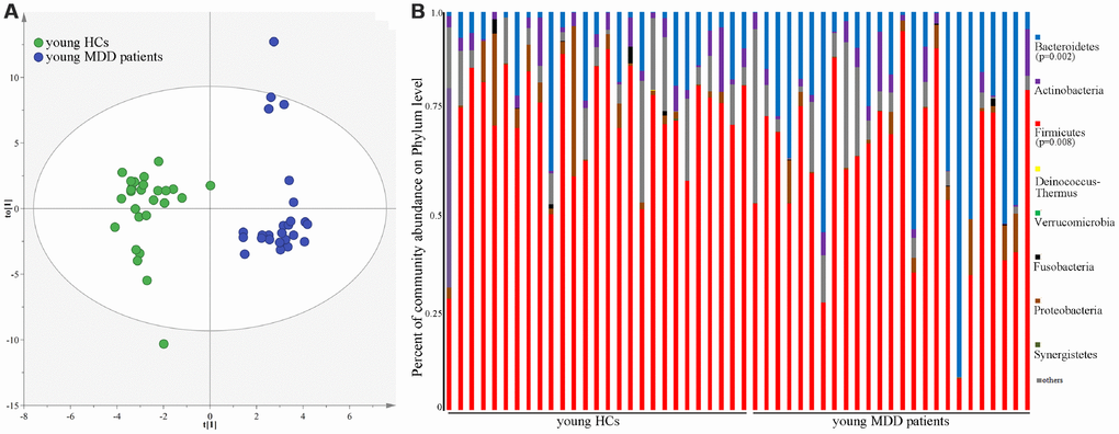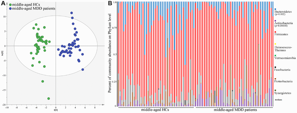 As shown in Figure 1, the results of abundance-based coverage estimator (ACE) and Chao1 showed that there was no significant difference in OTU richness between MDD patients (young and middle-aged, respectively) and their respective HCs. However, the OPLS-DA model built with young HCs and young MDD patients showed an obvious difference in microbial abundances between these two groups (Figure 2A). The relative abundances of Firmicutes and Bacteroidetes were significantly decreased and increased, respectively, in young MDD patients as compared with young HCs (Figure 2B). Meanwhile, the OPLS-DA model built with middle-aged HCs and middle-aged MDD patients showed an obvious difference in microbial abundances between these two groups (Figure 3A). The relative abundances of Bacteroidetes and Actinobacteria were significantly decreased and increased, respectively, in middle-aged MDD patients as compared with middle-aged HCs (Figure 3B).