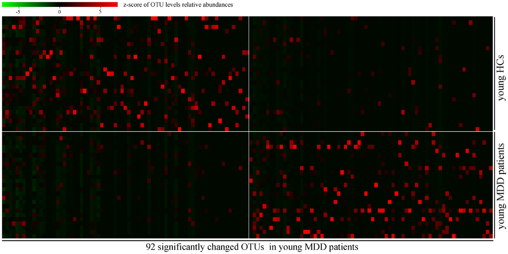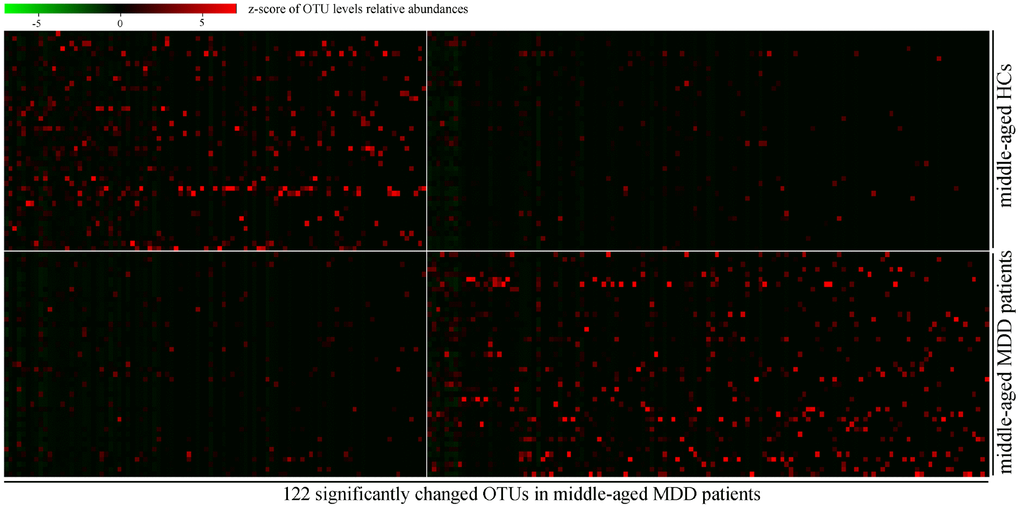 In order to find out the gut microbiota primarily responsible for the separation between MDD patients (young and middle-aged, respectively) and their respective HCs, the Random Forests classifier was used. A total of 92 OTUs responsible for the separation between young MDD patients and young HCs were identified (Figure 4). These OTUs were mainly assigned to the Families of Bacteroidaceae, Clostridiaceae_1, Coriobacteriaceae, Erysipelotrichaceae, Lachnospiraceae, Peptostreptococcaceae and Ruminococcaceae. Meanwhile, a total of 122 OTUs responsible for the separation between middle-aged MDD patients and middle-aged HCs were identified (Figure 5). These OTUs were mainly assigned to the Families of Lachnospiraceae, Coriobacteriaceae, Streptococcaceae, Prevotellaceae, Bacteroidaceae, Eubacteriaceae, Actinomycetaceae, Sutterellaceae, Acidaminococcaceae, Erysipelotrichaceae, Ruminococcaceae, and Porphyromonadaceae.