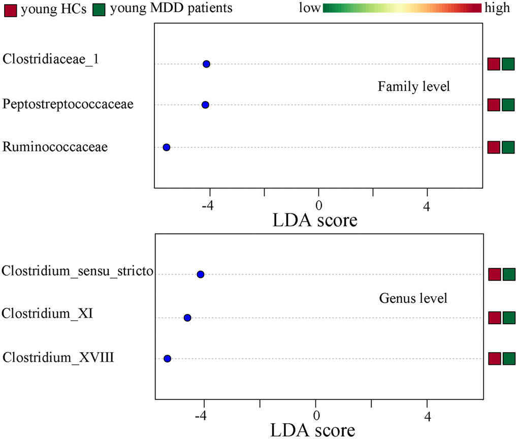 Many previous studies focused on the effects of gut microbiota on brain functions [21, 22]. However, few studies have taken the effects of age on gut microbiota into consideration when exploring the pathogenesis of MDD. Our previous study found that the relative abundances of Bacteroidetes and Actinobacteria were significantly decreased and increased, respectively, in MDD patients as compared with HCs [15]. But, in this study, we found that the relative abundances of Firmicutes and Bacteroidetes were significantly decreased and increased, respectively, in young MDD patients as compared with young HCs, and the relative abundances of Bacteroidetes and Actinobacteria were significantly decreased and increased, respectively, in middle-aged MDD patients as compared with middle-aged HCs. This disparity might be caused by the different age structures. Meanwhile, only 35 key discriminatory OTUs were significantly changed in both young (92 key discriminatory OTUs) and middle-aged (127 key discriminatory OTUs) MDD patients. Moreover, the differentially abundant bacterial taxa in young and middle-aged MDD patients were totally different at both Family level and Genus level. These results demonstrated that it was necessary to identify the age-specific differential gut microbiota in patients with MDD.