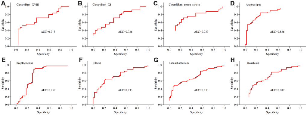 Differentially abundant bacterial taxa responsible for the differences between MDD patients (young and middle-aged, respectively) and their respective HCs were identified by the metagenomic Linear Discriminant Analysis (LDA) Effect Size (LEfSe) approach (LDA score>2.0 and p-value<0.05). In total, six bacterial taxa with statistically significant and biologically consistent differences in young MDD patients were identified (Figure 6). Meanwhile, fifteen bacterial taxa with statistically significant and biologically consistent differences in middle-aged MDD patients were identified (Figure 7). In addition, using the receiver operating characteristic (ROC) curve analysis, we found that Clostridium_sensu_stricto, Clostridium_XI and Clostridium_XVIII showed good diagnostic performance (area under the curve (AUC) >0.7) in diagnosing young MDD patients (Figure 8A–8C). We also found that Anaerostipes, Streptococcus, Blautia, Faecalibacterium and Roseburia showed good diagnostic performance (AUC>0.7) in diagnosing middle-aged MDD patients (Figure 8D–8H).