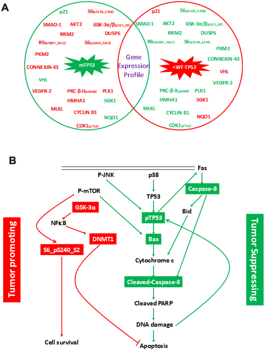 Expression of DNMT1, S6 (phosphorylated on serine residues at 240 and 244), and GSK-3α/3β (phosphorylated on serine residue at 21 of GSK3α or serine 9 of GSK-3β) were elevated in MIA-PaCa-2 cells with mTP53 (MIA-PaCa-2+pLXSN) (Table 2) and MIA-PaCa-2 cells (data not shown). On the same lines, expression of Bax, cleaved caspase-3, and cleaved caspase-8 were down-regulated in MIA-PaCa-2 cells expressing WT-TP53 (MIA-PaCa-2+WT-TP53) (Table 2). Thus, the cellular events seem to promote cell survival while actually inhibiting apoptosis in cells expressing mTP53 (Figure 1B). RPPA analysis demonstrated a crucial role for the WT-TP53 in mediating anti-tumor activity via modulating cell signaling.