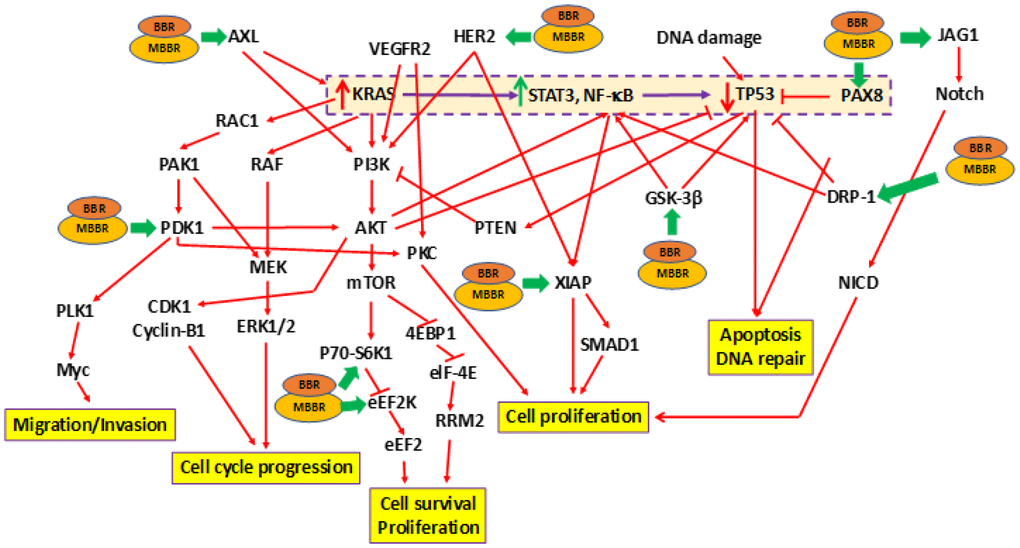 Earlier studies by us determined that BBR and MBBR inhibited proliferation of pancreatic cancer cells [31, 32]. In the current study, we determined the effect of treating MIA-PaCa-2+pLXSN cells with BBR and MBBR (NAX060) on cell signaling using RPPA. Treatment of MIA-PaCa-2+pLXSN cells (carrying mTP3) with BBR and MBBR altered the expression of 11 proteins to varying extents (Table 3). Each of these proteins influence tumorigenesis by regulating cell cycle progression, survival, proliferation, apoptosis and DNA repair. The effects of BBR and MBBR on the proliferation of MIA-PaCa-2+pLXSN cells is presented in the schematic (Figure 2). The schematic also represents the manner by which BBR and MBBR may directly or indirectly alter the expression of mTP53-associated signaling molecules (Figure 1A). RPPA analysis demonstrated the ability of BBR and MBBR to promote anti-tumor activity in MIA-PaCa-2+pLXSN and MIA-PaCa-2 (data not shown) cells by inhibiting cell cycle progression, proliferation, and survival to varying extents.
