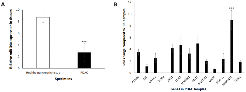 In order to appreciate the clinical relevance of the expression of miR-34a and its cognate targets in vivo, we monitored the expression profiles of miR-34a and associated signaling in vivo using PDAC specimens derived from human participants. miR-34a levels were significantly lower in PDAC specimens compared to healthy pancreatic tissues (Figure 4A). Also, we observed an increase in the expression of majority of the miR-34a targets (Figure 4B) that were analyzed by RPPA using lysates from MIA-PaCa-2 cells (Figure 3B, 3C). The only difference observed was as follows: (i) in vivo expression of PCD4 was at undetectable levels; and (ii) expression of SERPINE1 was significantly elevated compared to the rest of the miR-34a targets (Figure 5B). SERPINE1 levels have been identified to be significantly increased in colorectal cancer [50], lung cancer [51], gastric cancer [52], bladder cancer [53], head and neck squamous cell carcinoma [54], and others. Interestingly, earlier studies demonstrated ability of the SERPINE1 encoded protein, plasminogen activator inhibitor (PAI-1), to mediate proliferation and invasion of PDAC-derived cell lines, including MIA-PaCa-2 cells [55]. A recent study also concluded that the expression of SERPINE1 is negatively-related to the survival of PDAC patients [56]. Nonetheless, there are only three manuscripts that describe the expression of SERPINE1 and its association with PDAC and they were all performed with cell line models [55–57]. This is the first report of that links miR-34a>SERPINE1 expressions to PDAC using an in vivo patient-derived sample model.