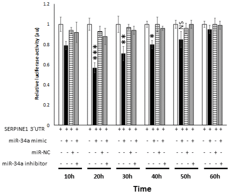 Luciferase reporter plasmids with wild-type SERPINE1 3′-UTR were purchased from GeneCopoeia. 293 cells were plated in 6-well plates. At 24 h post-plating, 293 cells were co-transfected with SERPINE1 3′-UTR luciferase reporter plasmid and miR-34a mimic, a scramble control (miR-NC), and/or miR-34a inhibitor using FuGene HD (Promega, Madison, WI, USA). At 10, 20, 30, 40, 50, and 60 h post transfection, supernatants were collected from each treatment and the luciferase activity measured using the Secrete-Pair Dual Luminescence Assay Kit (GeneCopoeia) as per the manufacturers’ recommendations.