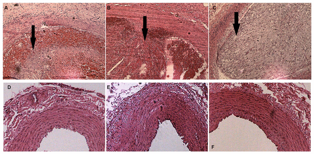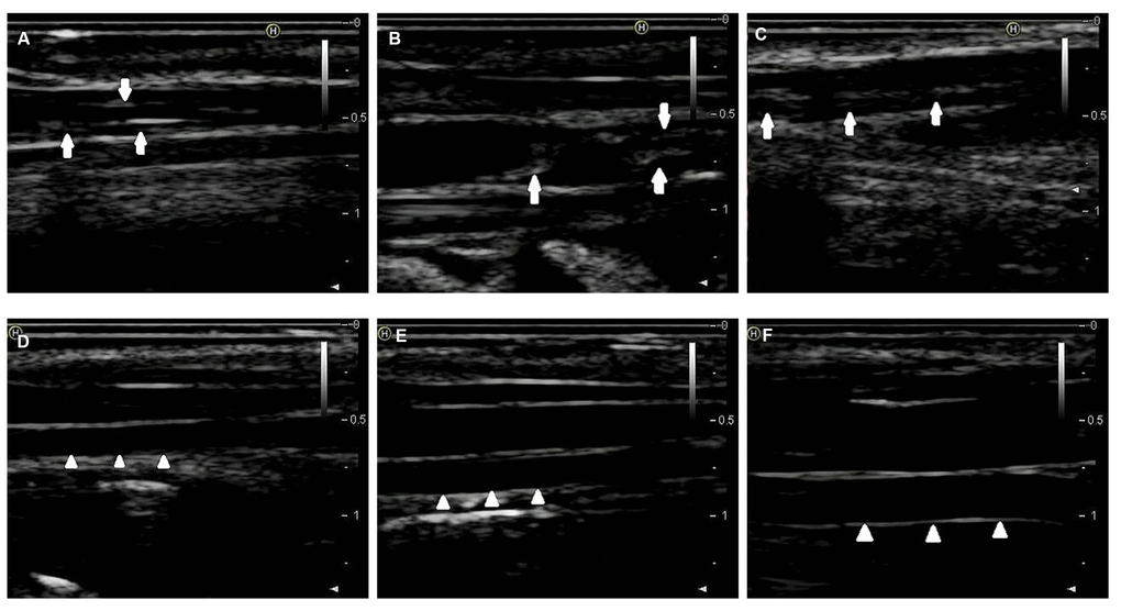 By combining endothelial injury and an atherogenic diet, we thickened and roughened the intima and induced multiple irregular hypoechoic plaques in rabbit right common carotid arteries as indicated by two-dimensional (2D) ultrasound at the 12th week (Figure 1A–1C). In contrast, the carotid artery intima of rabbits fed normal chow remained clear, smooth and continuous with no obvious changes (Figure 1D–1F). Hematoxylin and eosin (H&E) was used to stain vascular tissue from sites with obvious plaques in the AS group, and tissues were imaged using 2D ultrasound. Thickened intimae, foam cell deposition, smooth muscle cell proliferation and varying degrees of plaques on rabbit carotid artery intimae were observed (Figure 2A–2C). However, the intimae of the control group were smooth and intact, and no obvious foam cell deposition or smooth muscle cell proliferation was observed (Figure 2D–2F).