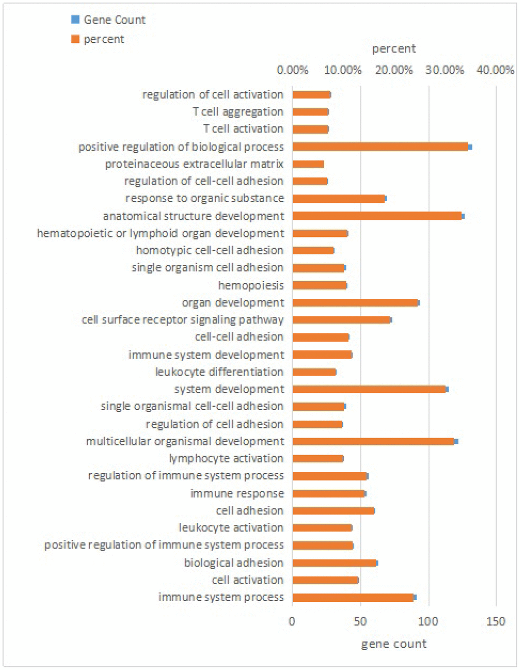 RNA interactions exert various functions expressed in associated mRNA genes. GO and KEGG analyses were conducted on the mRNA genes of the lncRNA-miRNA-mRNA network. Briefly, 424 significant GO-BP terms were observed and enriched (q < 0.05, Supplementary Table 5) in the GO enrichment analysis. The top three terms included immune system process (GO: 0002376), cell activation (GO: 0001775), and biological adhesion (GO: 0022610). Some cognition-related terms were also visualized, such as cell adhesion (GO: 0007155), immune response (GO: 0006955), T cell activation (GO: 0042110), leukocyte activation (GO: 0045321), and cell proliferation (GO: 0008283) (Figure 3). Through the KEGG survey, 33 significant KEGG terms were clustered (p < 0.05, Supplementary Table 6). We observed several cognition-associated terms, including cell adhesion molecules (CAMs) (ocu04514), T cell receptor signaling pathway (ocu04660), cytokine-cytokine receptor interaction (ocu04060), ECM-receptor interaction (ocu04512), and natural killer cell-mediated cytotoxicity (ocu04650) (Figure 4). Overall, the lncRNA-miRNA-mRNA network is involved in the etiopathogenesis of AS from various aspects.