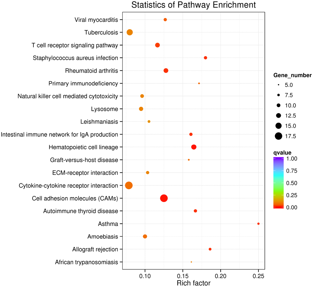 We utilized the GO database to analyze the lncRNA-miRNA-targeted genes. GO analysis was conducted with the GO-seq R package. Briefly, 424 GO-BP terms were significantly enriched (q < 0.05). As a database resource, KEGG can comprehend high-level utility functions of biological systems. KOBAS software was used to check the statistical enrichment of lncRNA target or dysregulated genes in the KEGG pathways. Thirty-three KEGG terms were significantly enriched (q < 0.05).