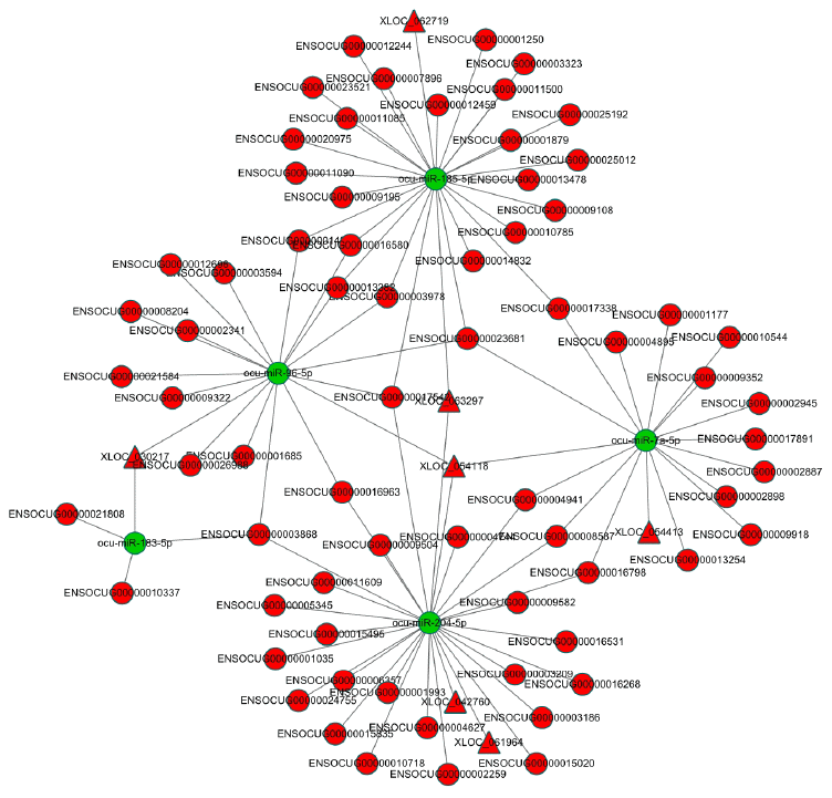 | XLOC_063297 | Up | 0.001644 | ocu-miR- 185-5p | down | 0.035479 | ENSOCUT00000011082 | ENSOCUG00000011085 | up | CTSS | 0.00164462 |