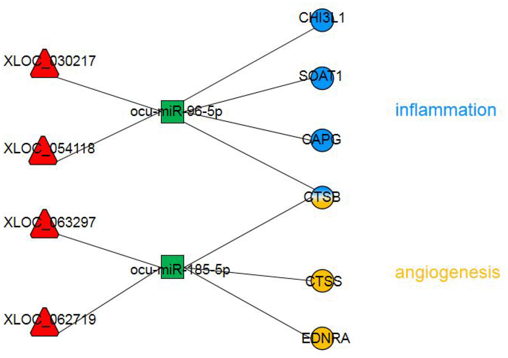 We applied rigorous restrictions to select the greatest probable lncRNA-related-ceRNA network that participated in the origin, development and changes in AS. First, we selectively analyzed the lncRNA-mRNA network by examining the likely significantly dysregulated RNAs. Next, the concentrations of the selected lncRNAs, miRNAs, and their target genes were determined. Third, the target genes in the chosen triple pairs should be related to AS. Finally, six qualified triple pairs were selected (Figure 6). We discovered that XLOC_054118 and XLOC_030217 were ceRNAs of ocu-miR-96-5p targeting CHI3L1, SOAT1, CAPG and CTSB. Macrophages, which are the primary cells of innate immunity, have vital effects in each stage of AS [30]. CHI3L1 has been detected to to be secreted from differentiated macrophages in early-stage AS lesions [31]. SOAT1-/- regulated the suppression of inflammatory molecules, including TNF-α, IL-6 and IL-1b, and alleviated the development of atherosclerotic lesions, exhibiting a positive effect [32]. Association analysis revealed that the rs6886 polymorphism in CAPG was linked with carotid intima-media thickness, which is a validated marker of AS; this mechanism could be associated with differential macrophage migration ability and the inflammation process [33]. Levels of CTSB mRNA and protein in atherosclerotic lesions of apoE-deficient mice have been observed to increase; CTSB immunoreactivity levels were highest in areas next to the lumen and in macrophages [34]. Interestingly, we found that the above four genes are associated with macrophages and involved in the inflammatory response, which further affects AS. Pordzik J [35] reported that as a platelet miRNA, miR-96 could be exploited as a biomarker in inflammatory disorders, such as cardiovascular disorders. Therefore, to the best of our knowledge, this is the first report that implies the lncRNAs XLOC_054118 and XLOC_030217 function as molecular sponges of the miRNA ocu-miR-96-5p to upregulate macrophages and inflammation-associated gene expression consequently participating in AS. Further experiments should be conducted to acquire detailed information on the pathway of genes and function of this network.