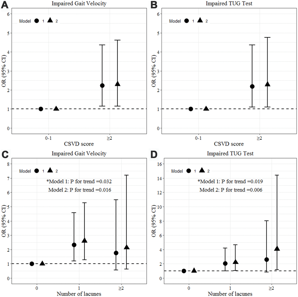 Regarding the clinical rating scales (Table 3), no significant associations were found between performance and the CSVD imaging markers of WMH or CMBs. Large PVS was significantly correlated with poorer Tinetti test performance after adjustment for age, sex, and height but did not survive additional adjustment. Presence of lacunes was positively associated with prolonged 3-m walking (β=0.118, P=0.037) and duration of the TUG test (β=0.112, P=0.047) after full adjustment, therefore logistic regression was further applied to evaluate the correlations between the severity of lacunes and impaired gait velocity or TUG test. As shown in Figure 1C and 1D, participants with more lacunes exhibited higher risk of impaired gait velocity (P for trend=0.016 in the fully adjusted model) and impaired TUG test (P for trend=0.006 in the fully adjusted model). For participants with 1 lacune, there was an OR of 2.6 (95%CI: 1.3 to 5.3) for impaired gait velocity and an OR of 2.2 (95%CI: 1.1 to 4.7) for impaired TUG test compared to those without lacunes after full adjustment. Those with 2 or more lacunes had a fully adjusted OR of 4.1 (95%CI: 1.2 to 14.4) for impaired TUG test and a fully adjusted OR of 2.1 (95%CI: 0.6 to 7.2) for impaired gait velocity, although this finding was not statistically significant.