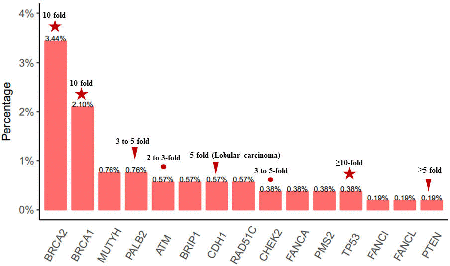 Our study demonstrated the detection of a total of 76 LP/P germline mutations in 15 genes from 58 patients, revealing an overall germline mutation rate of 11.1%. In contrast, another study of a large cohort of unselected breast cancer patients from North China has revealed an LP/P germline mutation rate of 9.2% (743/8085) [25]. By identifying the 15 genes potentially associated with increased genetic cancer susceptibility in our population, we could advocate for the inclusion of these 15 genes in the routine diagnostic workup for the assessment of genetic cancer predisposition instead of just testing for only BRCA1/2 mutation status.