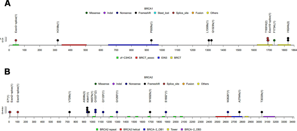 Twenty-nine (5.53%, 29/524) patients carried germline BRCA1/2 mutation; including 11 (2.10%, 11/524) patients with BRCA1 and 18 (3.44%, 18/524) patients with BRCA2 mutations. As shown in Figure 2A–2B, BRCA1 T1691K (n = 2) and I1824fs (n = 2) and BRCA2 A938fs (n = 3) were the most frequent LP/P germline BRCA1/2 mutations in our cohort. In addition, 30 (5.72%) patients carried a total of 38 LP/P mutations in other cancer susceptibility genes beyond BRCA1/2. Mutations in genes beyond BRCA1/2 detected in the cohort included MUTYH (n = 4), PALB2 (n = 4), ATM (n = 3), BRIP1 (n = 3), CDH1 (n = 3), RAD51C (n = 3), CHEK2 (n = 2), FANCA (n = 2), PMS2 (n = 2), TP53 (n = 2), FANCI (n = 1), FANCL (n = 1) and PTEN (n = 1). Interestingly, among the 15 genes with germline mutations, 7 genes belong to Fanconi anaemia family of genes, including BRCA2, PALB2, BRIP1, RAD51C, FANCA, FANCI and FANCL, with 53.4% (31/58) of the patients carrying germline mutations in any of these genes. No LP/P germline mutations were found in the remaining 47 cancer susceptibility genes included in the panel. All the LP/P germline mutations detected in our cohort were listed in Table 2.