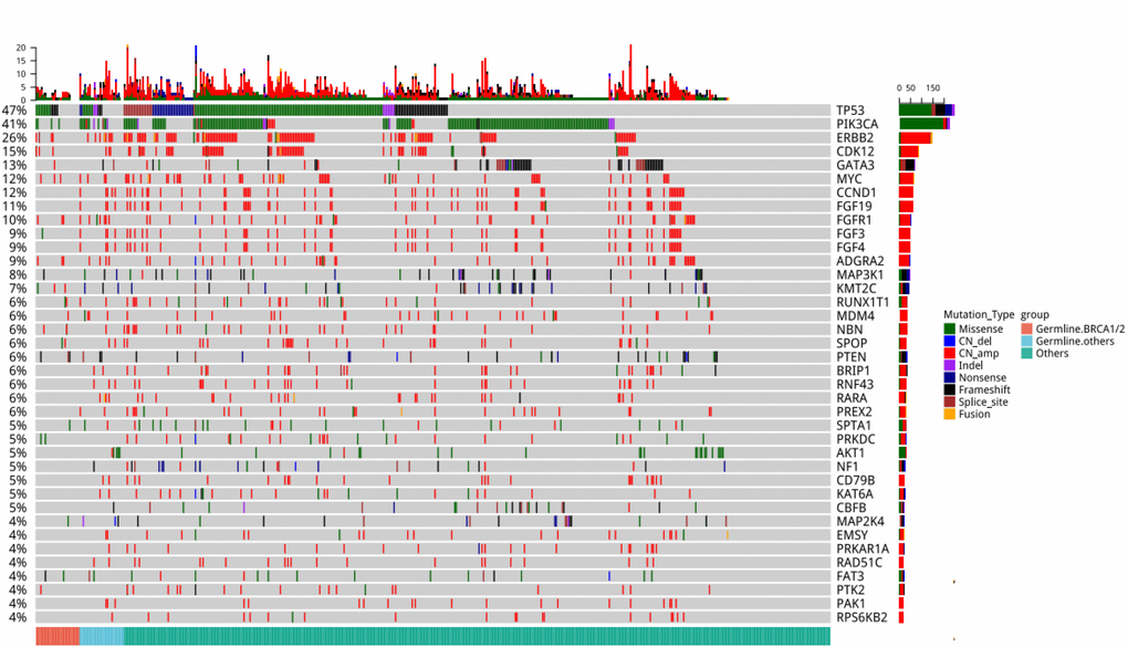 To understand the interplay between germline and somatic mutations in breast cancer patients, sequencing data derived from the paired tumor samples of the 524 breast cancer patients were analyzed. Genomic alterations with detection rate of more than 4% were shown in Figure 3. Interestingly, somatic TP53 mutations were detected in all (100%, 11/11) and a majority (67%, 2/3) of the patients with germline BRCA1 and CDH1 mutations, respectively. On the other hand, no somatic TP53 mutations were detected in all the patients with germline ATM (n=3) and TP53 (n=2). In addition, somatic mutations in PIK3CA were more frequent among patients with germline CDH1 (3/3). Furthermore, a patient with pathogenic germline PALB2 mutation (p.Q921fs) also had somatic PALB2 mutation (p.D525fs).